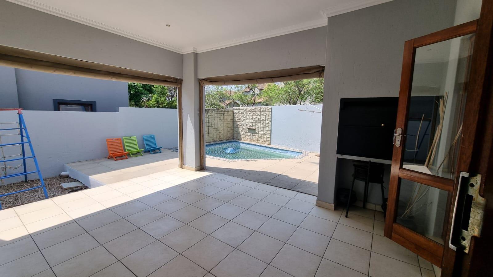 This beautifully renovated 3-bedroom, 2.5-bathroom home is set in a sought-after secure estate and perfectly balances style, comfort, and practicality. Designed for modern living, it features spacious open-plan interiors with a sleek kitchen, private scullery, and light-filled lounge and dining areas leading to a covered patio, landscaped garden, and sparkling swimming pool. The main bedroom boasts a walk-in dressing room, private balcony, and luxurious ensuite, while the additional bedrooms are well-sized with a shared family bathroom. Extra amenities include staff accommodation (or guest suite), double garage with direct access, ample parking, built-in braai, and two storage rooms. Fully solar-powered with four lithium batteries, an inverter, and a JOJO water tank system, the home offers sustainable living without compromise. The estate provides 24-hour security and controlled access, while the prime location places you close to Broadacres Academy, top private schools, Fourways Life Hospital, shopping centres, and just minutes from Lanseria Airport — making this the ideal family home or lock-up-and-go lifestyle choice.