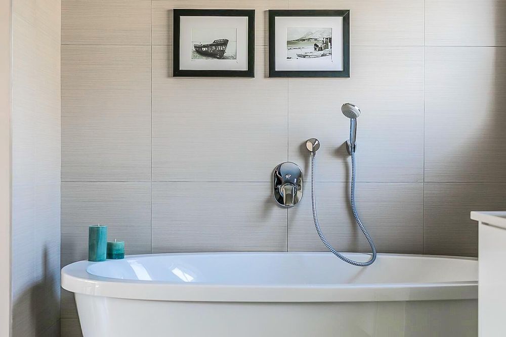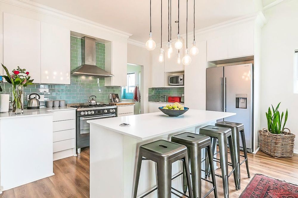 The modern kitchen is a chef's delight, featuring a centre island, gas hob, electric oven, and separate scullery with space for three under-counter appliances. Unique light fittings add a touch of elegance to the kitchen and dining area. The home also includes a guest cloakroom.
