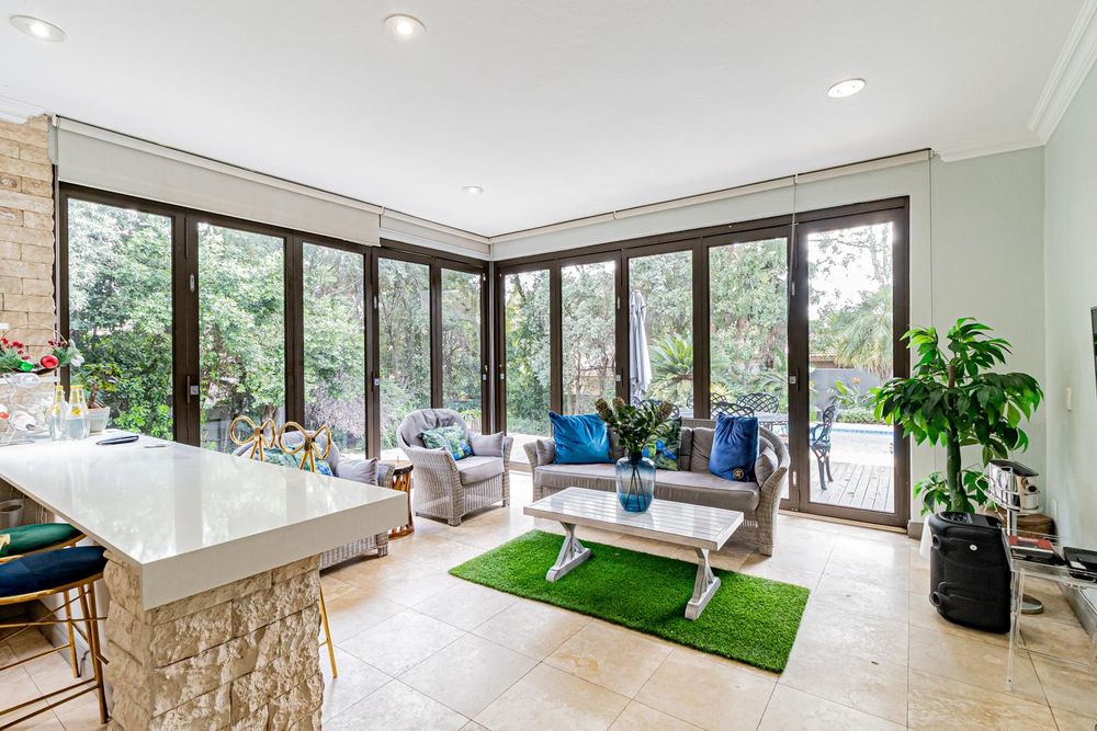 Large glass openings lead to an inviting covered patio with a built-in bar ideal for entertaining guests. Overlooking a sparkling swimming pool and beautifully landscaped garden the outdoor area offers a tranquil retreat for leisure and social gatherings alike.