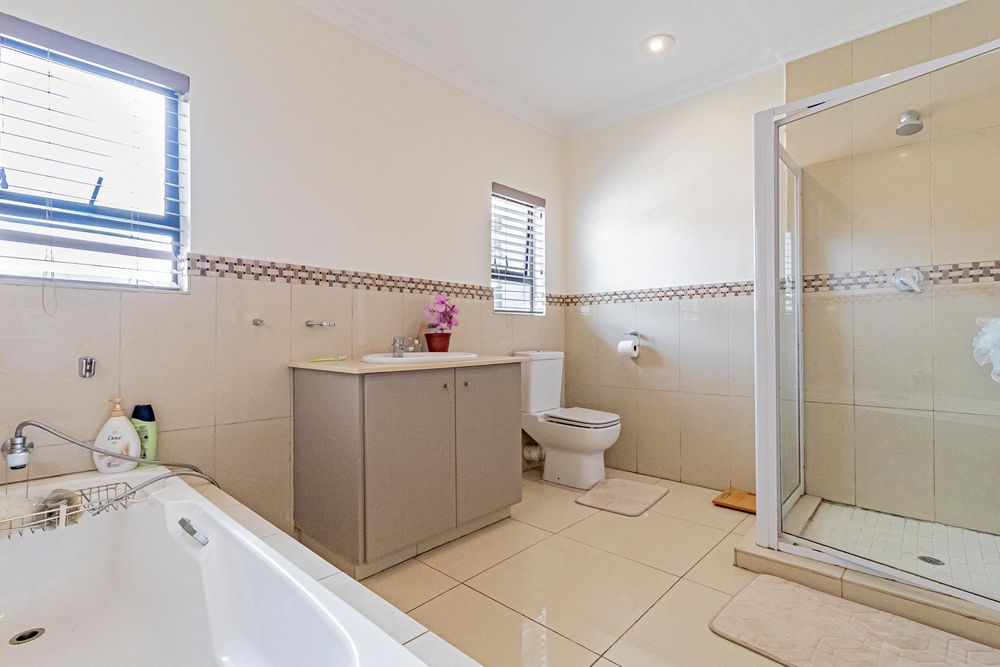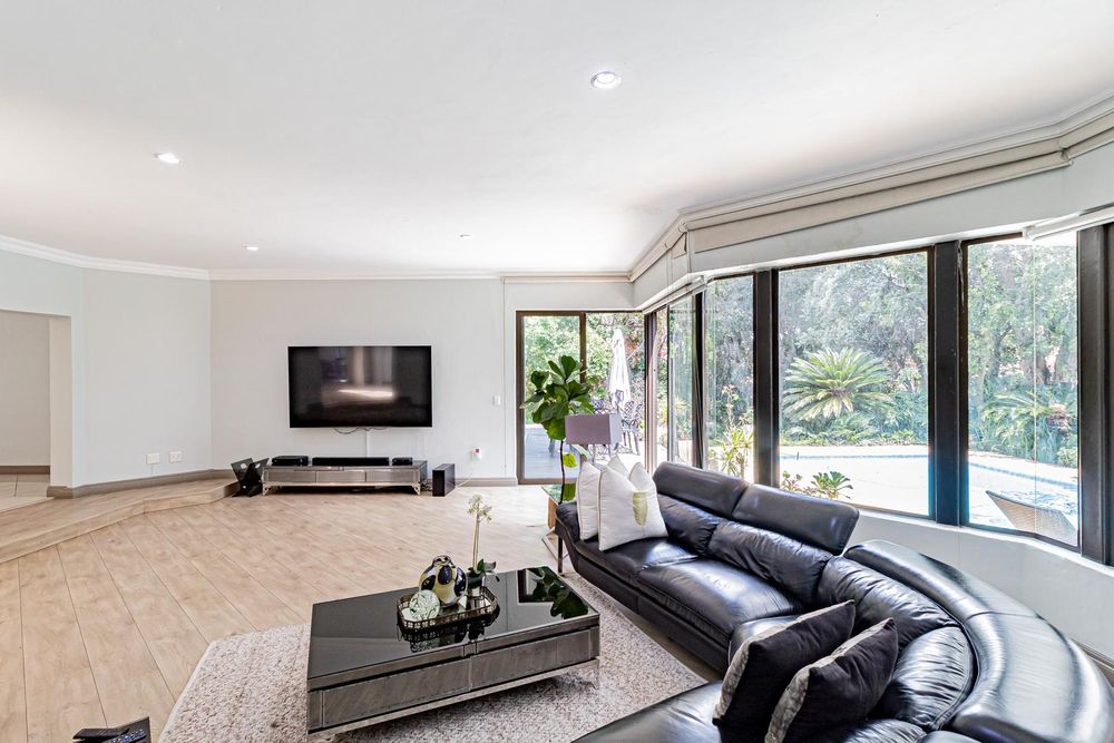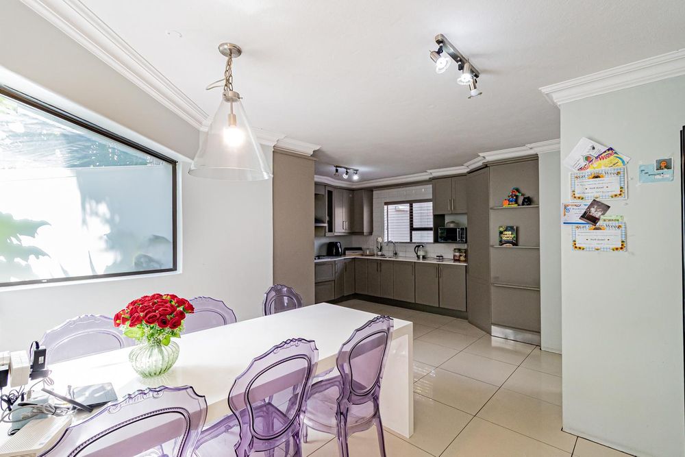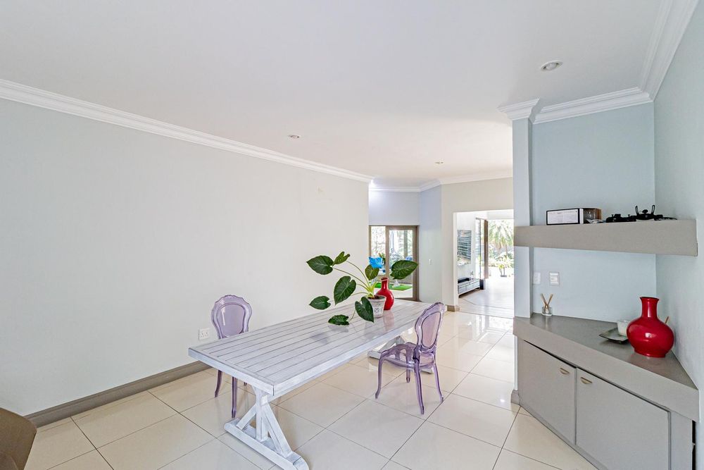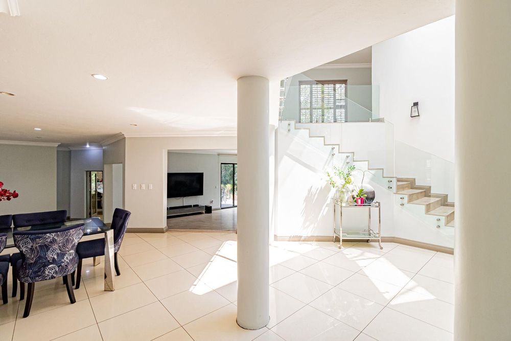 Upstairs is a relaxed pyjama lounge which creates a central family space surrounded by four generously sized bedrooms. Two bedrooms enjoy private en suite bathrooms while the remaining rooms share a modern family bathroom. Each bedroom is fitted with built-in cupboards, air conditioning and opens onto a spacious balcony with a built-in braai. A unique spiral staircase connects the balcony directly to the garden enhancing the home’s indoor-outdoor lifestyle.