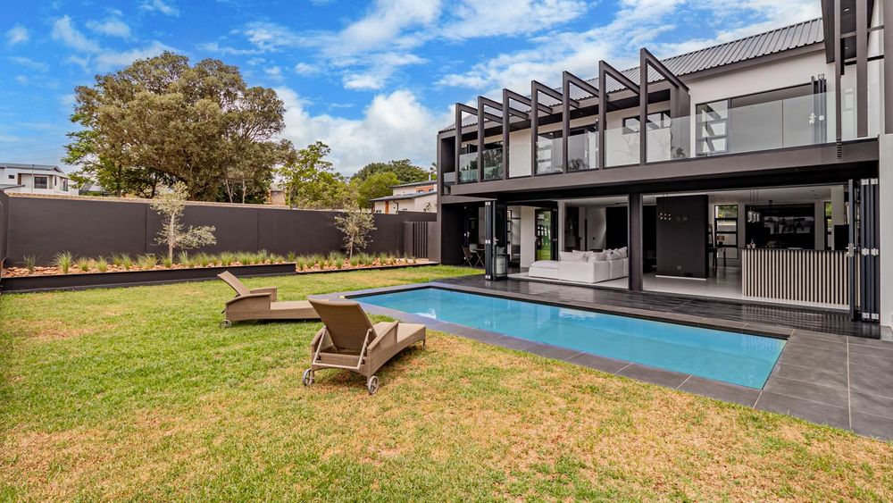5 Spacious En-Suite Bedrooms, Open-Plan Living Spaces, Modern Kitchen with Black Finishes and inbuilt fridge, microwave and coffee maker, Bar Area & Entertainer’s Patio, Dedicated Study/Home Office, Pajamas Lounge, Sparkling Swimming Pool, Garden, Staff Accommodation, 4 Garages.