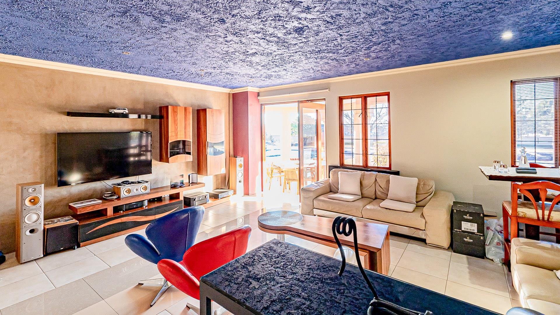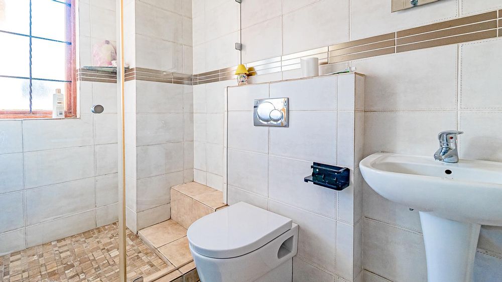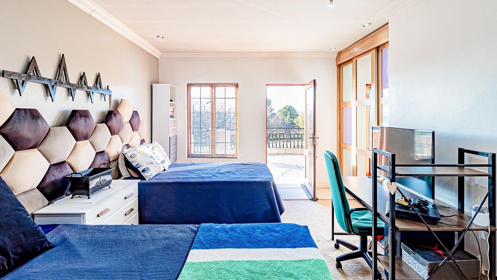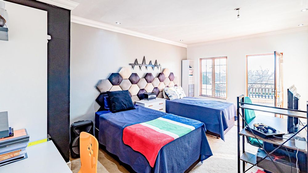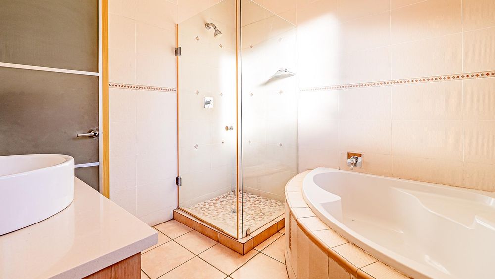 Accommodating multiple vehicles is effortless with three single garage doors leading to a spacious tiled garage area, one providing access to the back garden, and a shade-net carport for an additional vehicle. A storeroom off the courtyard with a roll-up garage door offers convenient storage solutions.
