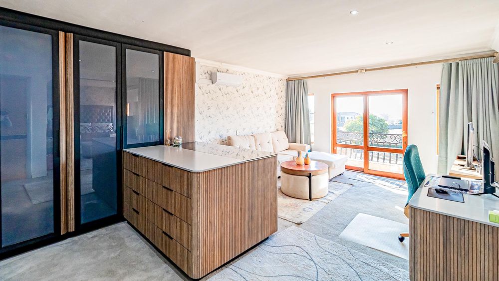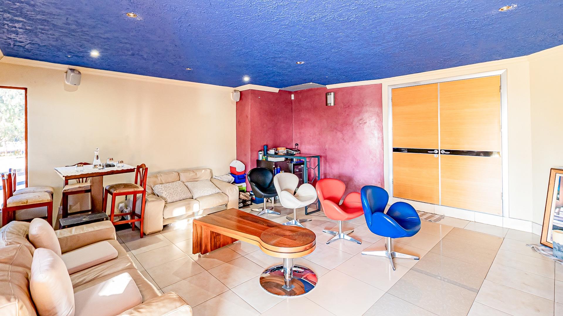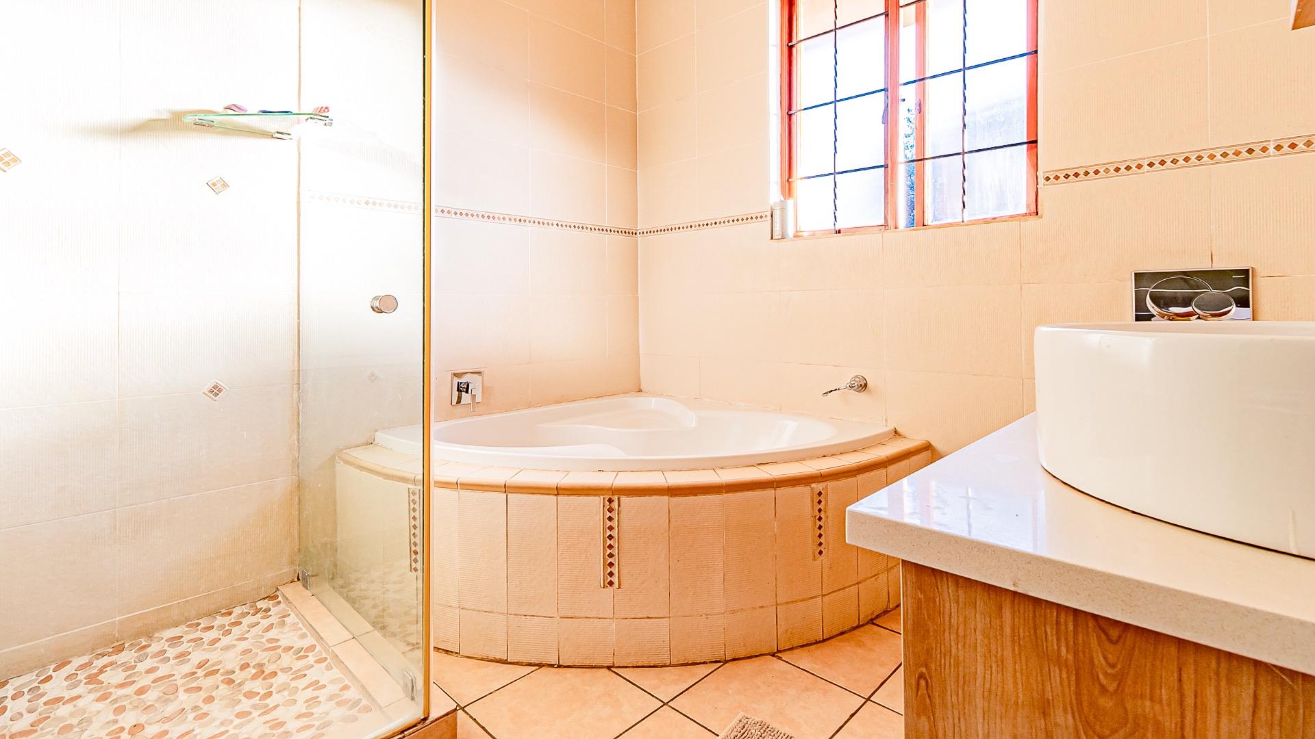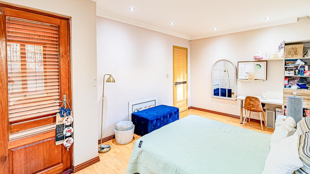 Accommodating multiple vehicles is effortless with three single garage doors leading to a spacious tiled garage area, one providing access to the back garden, and a shade-net carport for an additional vehicle. A storeroom off the courtyard with a roll-up garage door offers convenient storage solutions.