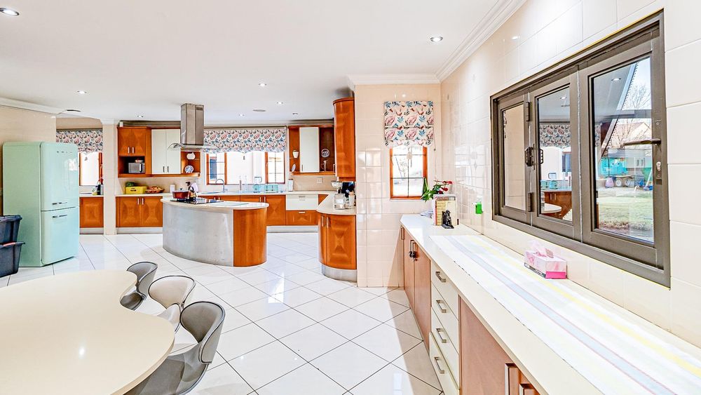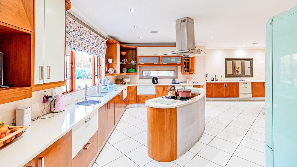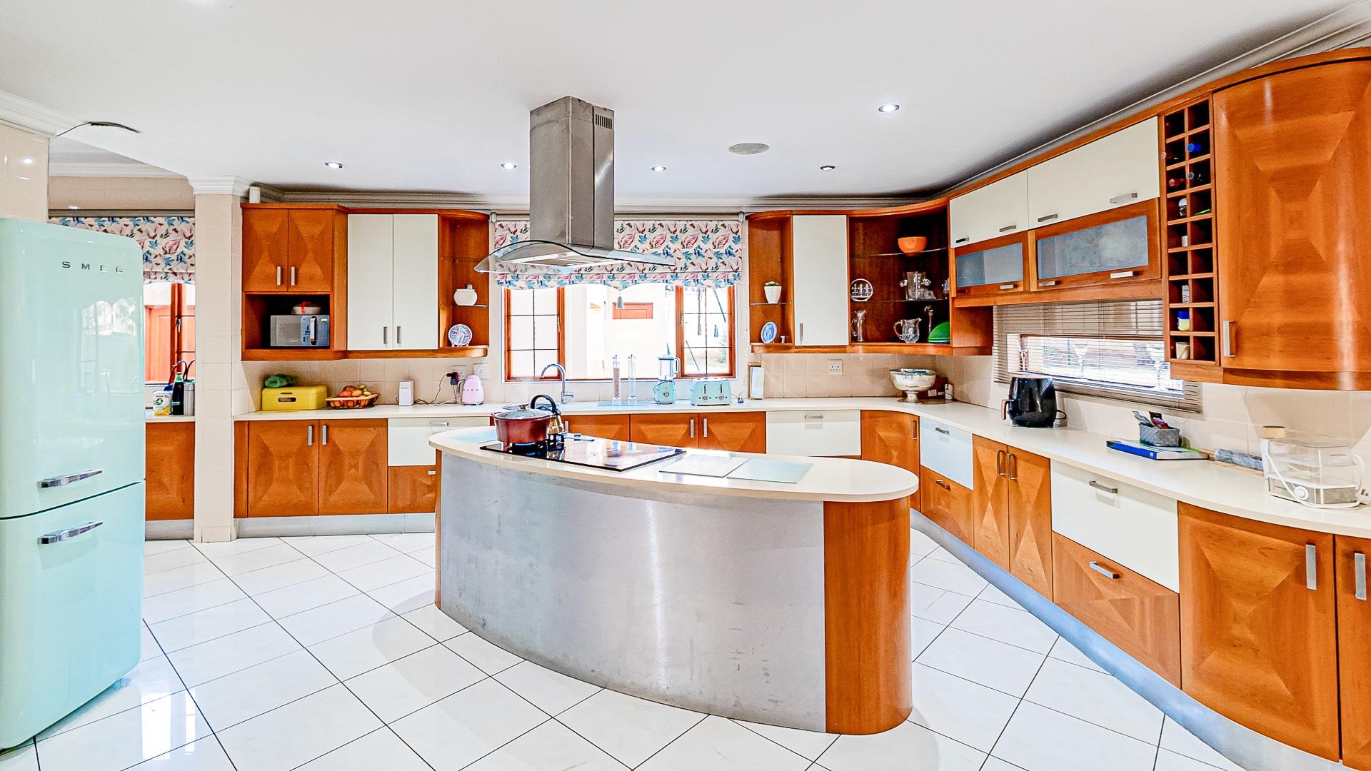 The heart of the home is a chef's dream, equipped with a center island featuring two gas hobs, a 4-plate glass hob stove, Cherry wood cabinets, Caesar stone countertops, a breakfast nook, pantry cupboards, and Roman blinds. An adjacent scullery offers additional convenience with ample cupboard space and dual washing basins.