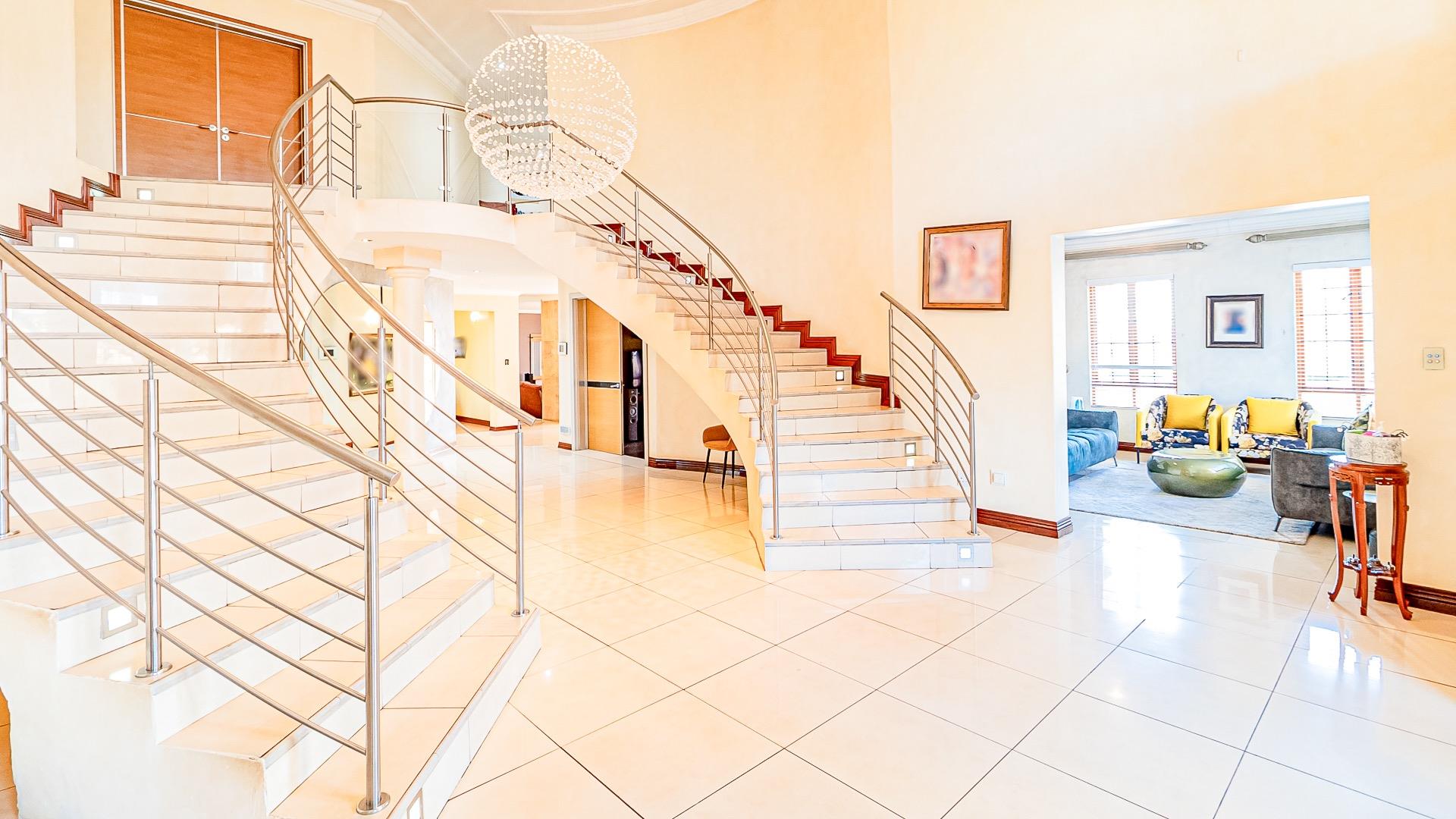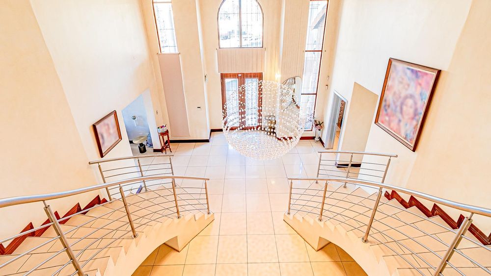 Grand Entrance: Be welcomed by a magnificent entrance hall featuring a double-volume ceiling, cream tile flooring, and a stunning chandelier that sets the tone for the elegance within.