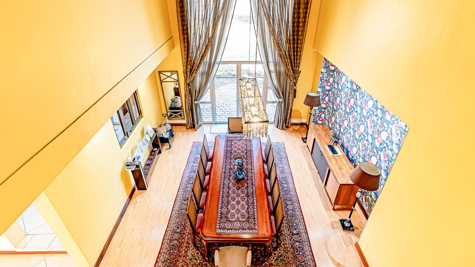 - A dining room featuring laminated wood flooring, double-volume ceiling, and aluminium doors opening to the garden.
