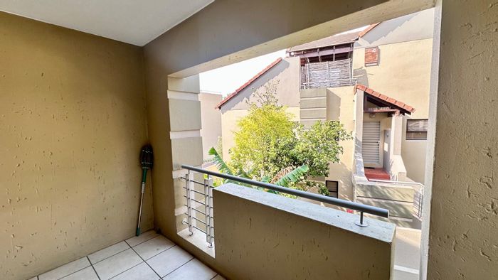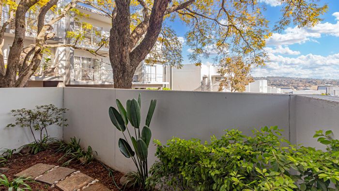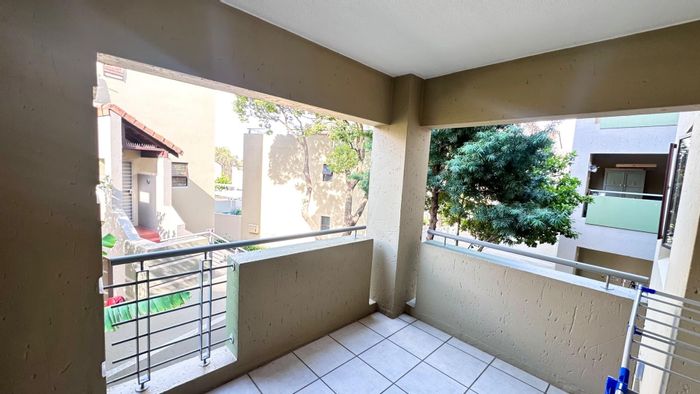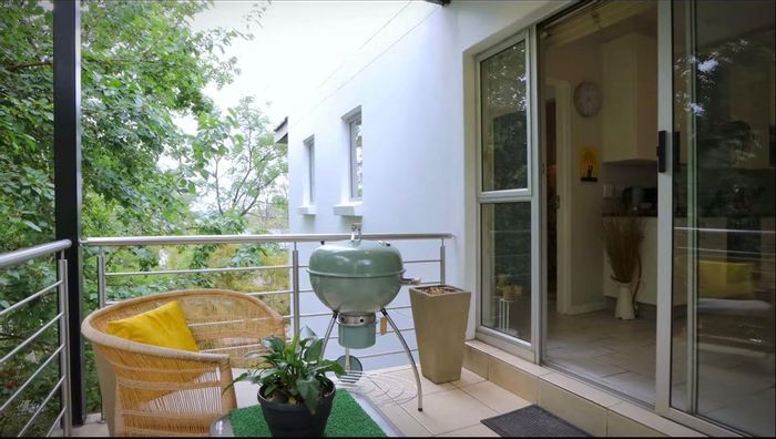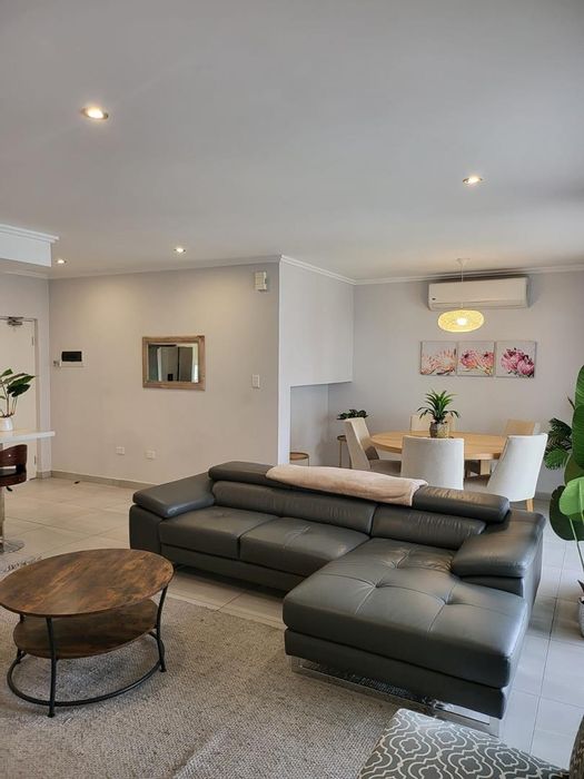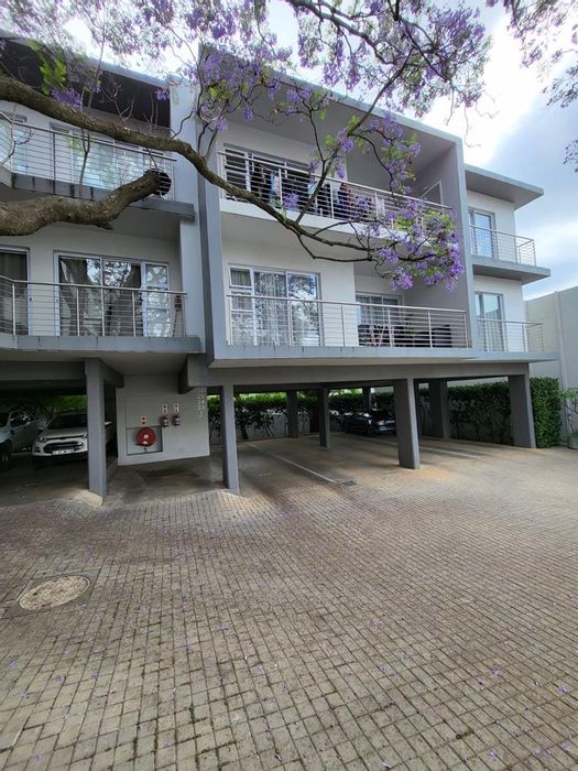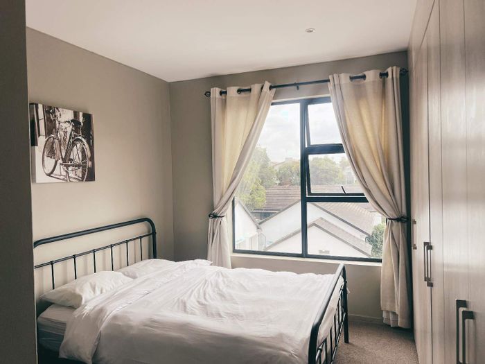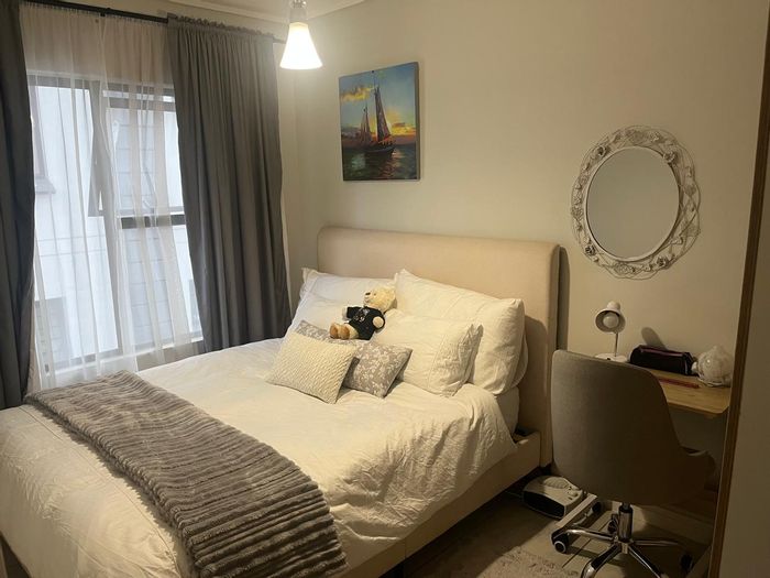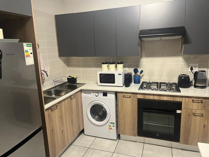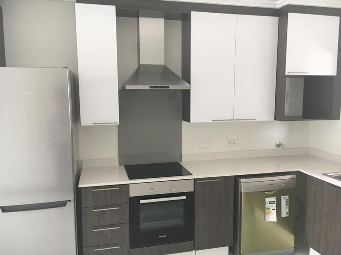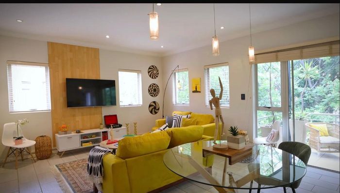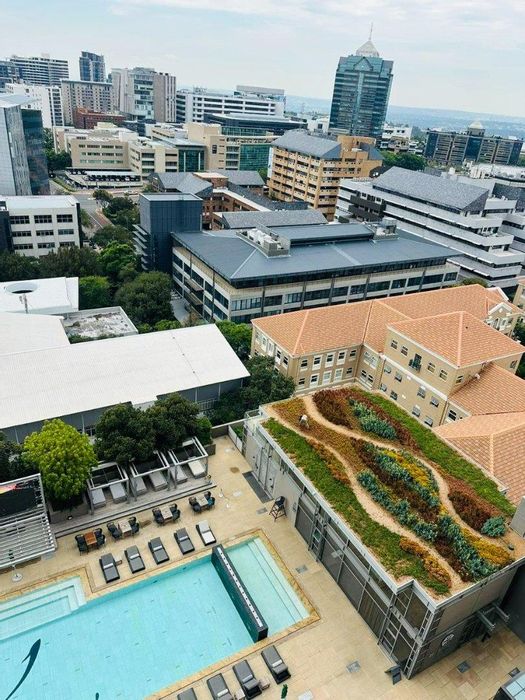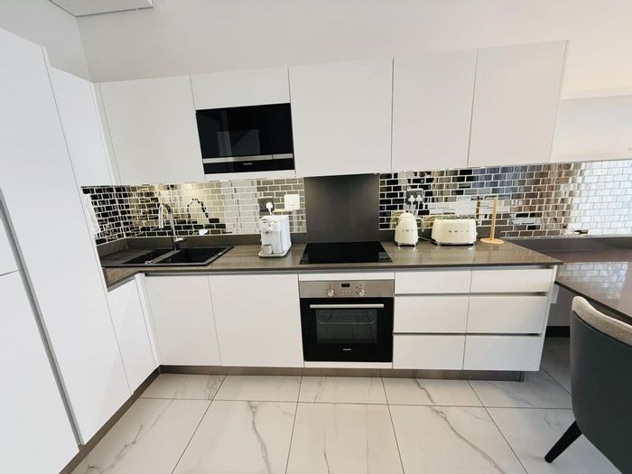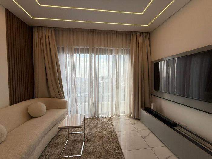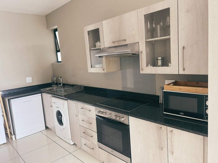 Fully furnished apartment in prestigious Simba Residential, Sandown — open-plan living with a modern kitchen, landscaped communal areas, 24-hour security and secure open parking; 1 bed, 1 bath.