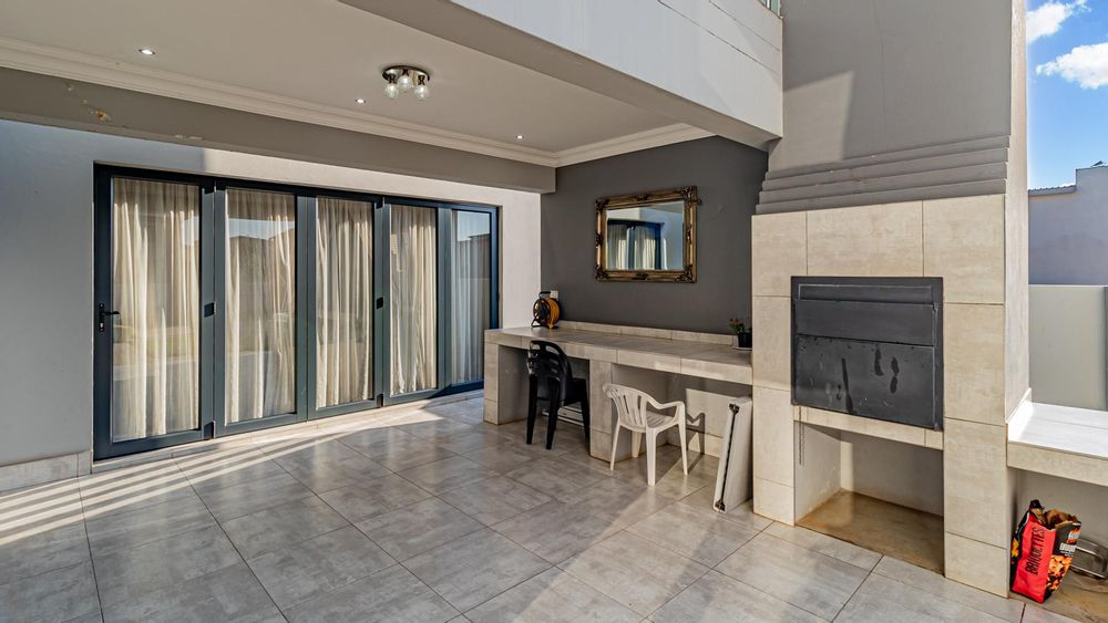 Grand double-volume entrance in Zambezi Manor Estate, covered patio, chef’s kitchen with scullery, private balconies off each bedroom and pajama lounge; secure 24/7 estate living. (4/3/2)