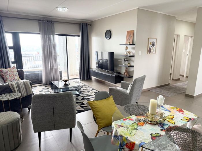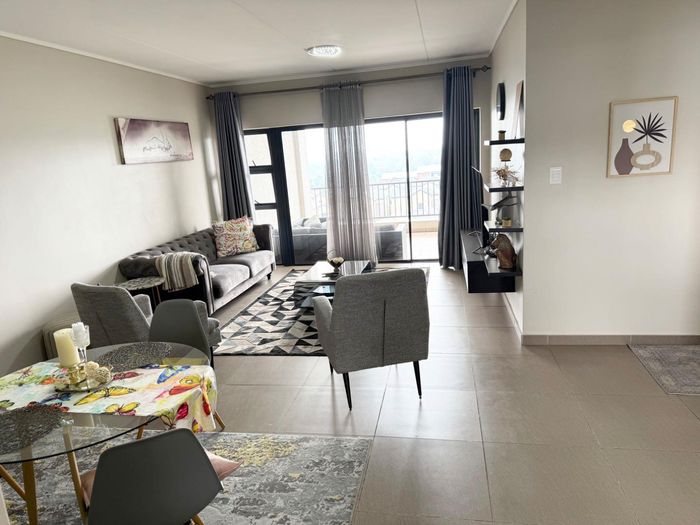 Effortless urban living in Kyalami with quick access to shops, parks and recreation; furnished three bedroom, two bath apartment featuring a modern kitchen and lounge with leafy views.