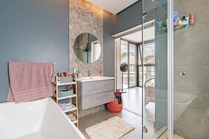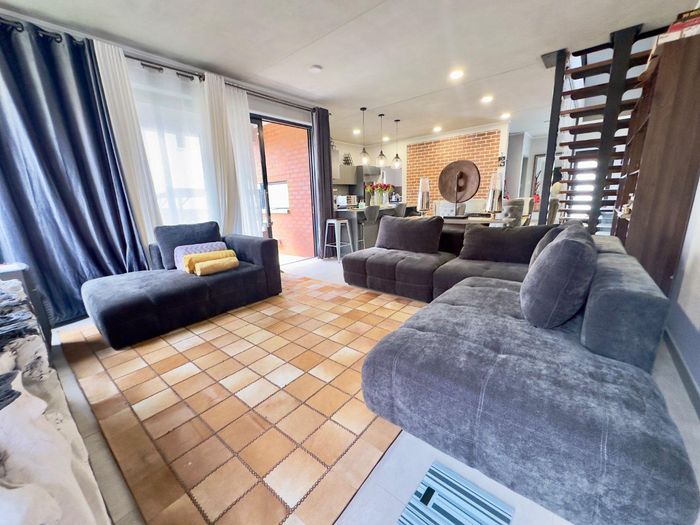 Entertainer's haven with modern industrial flair in a secure estate near shops, restaurants and schools — covered patio with built-in braai, wrap-around lapa, four bedrooms, three baths, double garage.