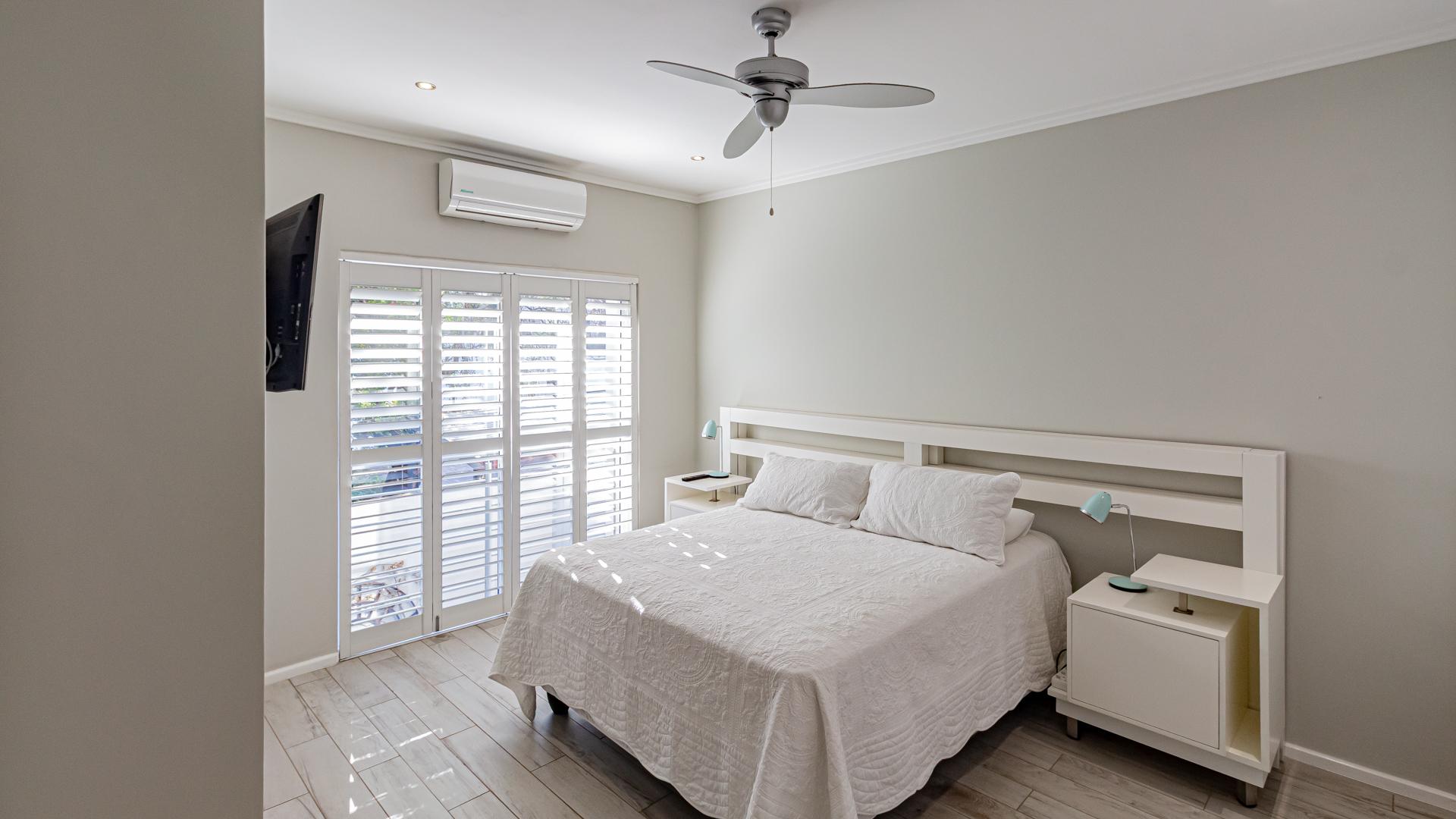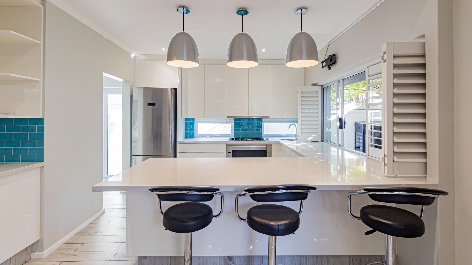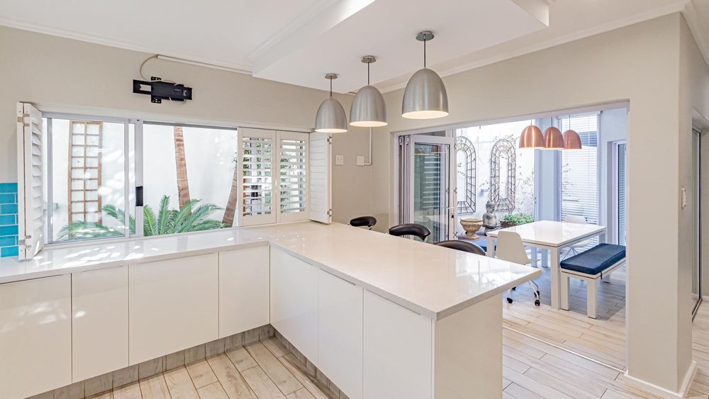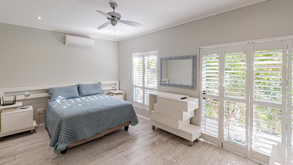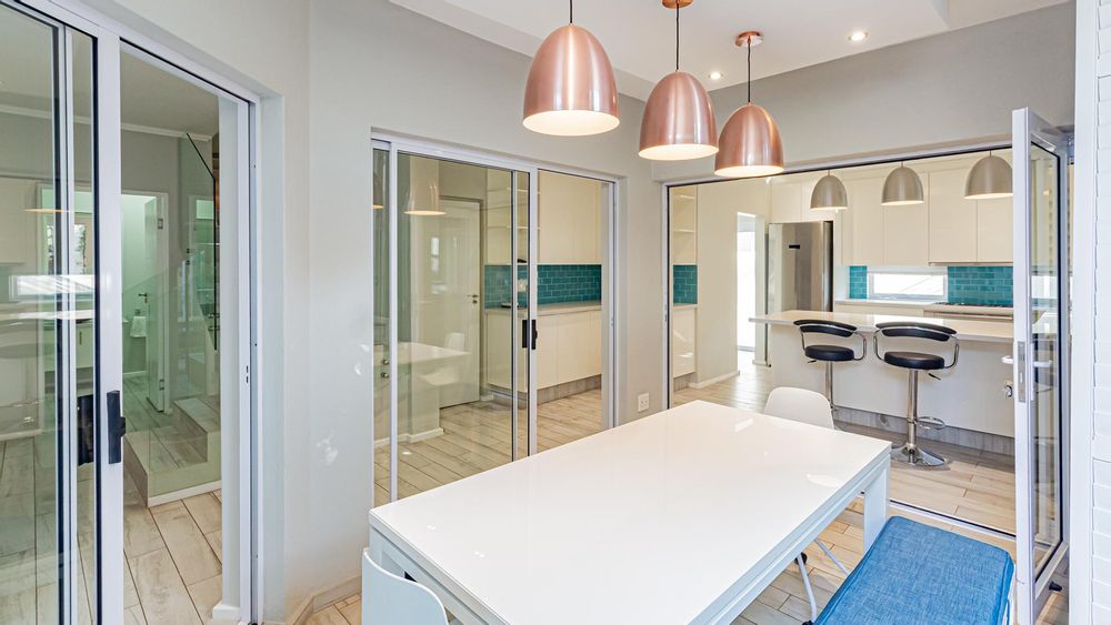 The open-plan layout flows seamlessly from the designer kitchen—fitted with Caesarstone countertops, SMEG gas hob and oven, and a separate scullery—into elegant living spaces enhanced by designer lighting, air conditioning, and American shutters. A beautiful glass balustrade staircase leads upstairs to three en-suite bedrooms, including a luxurious main suite with walk-in closet and Juliet balcony.