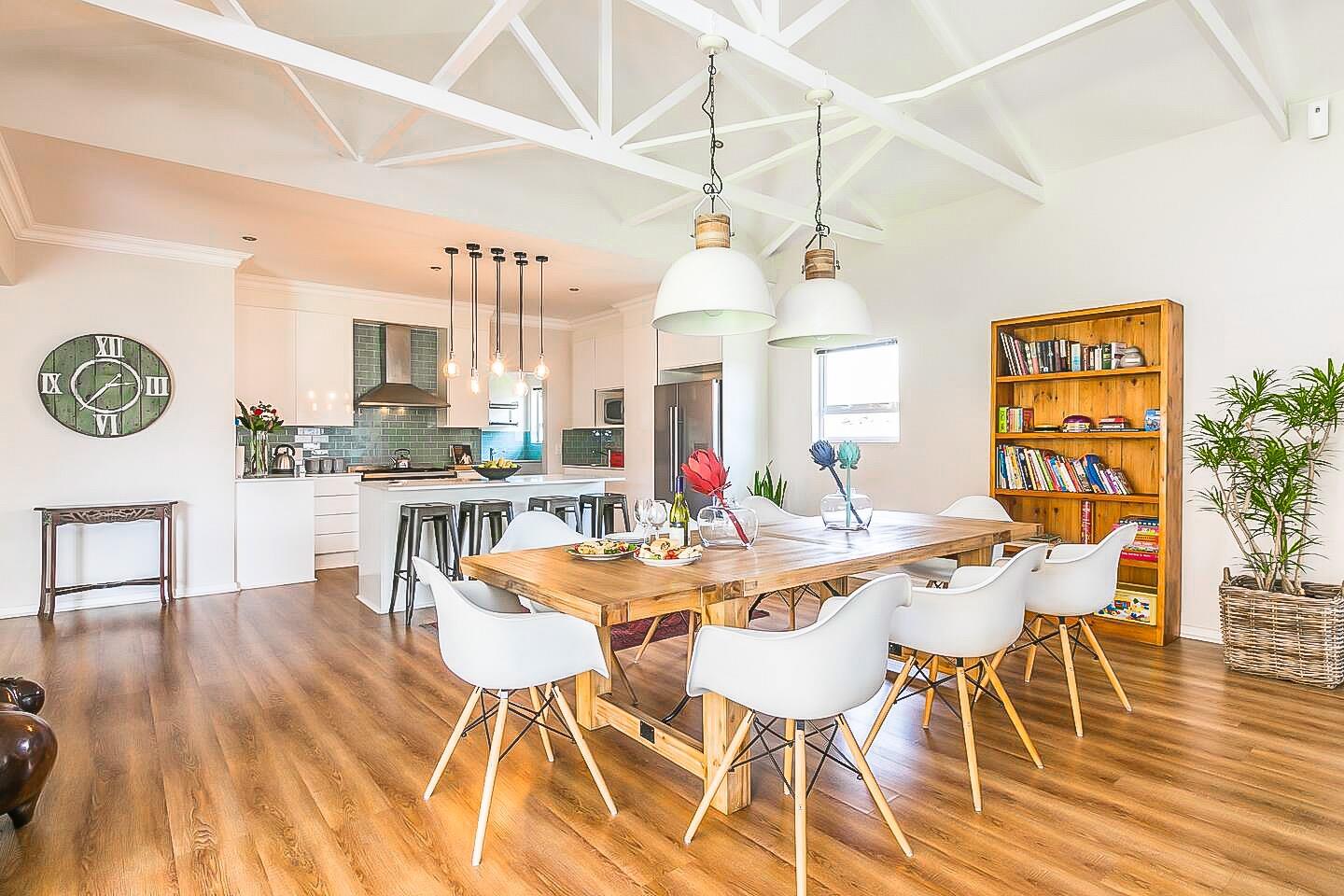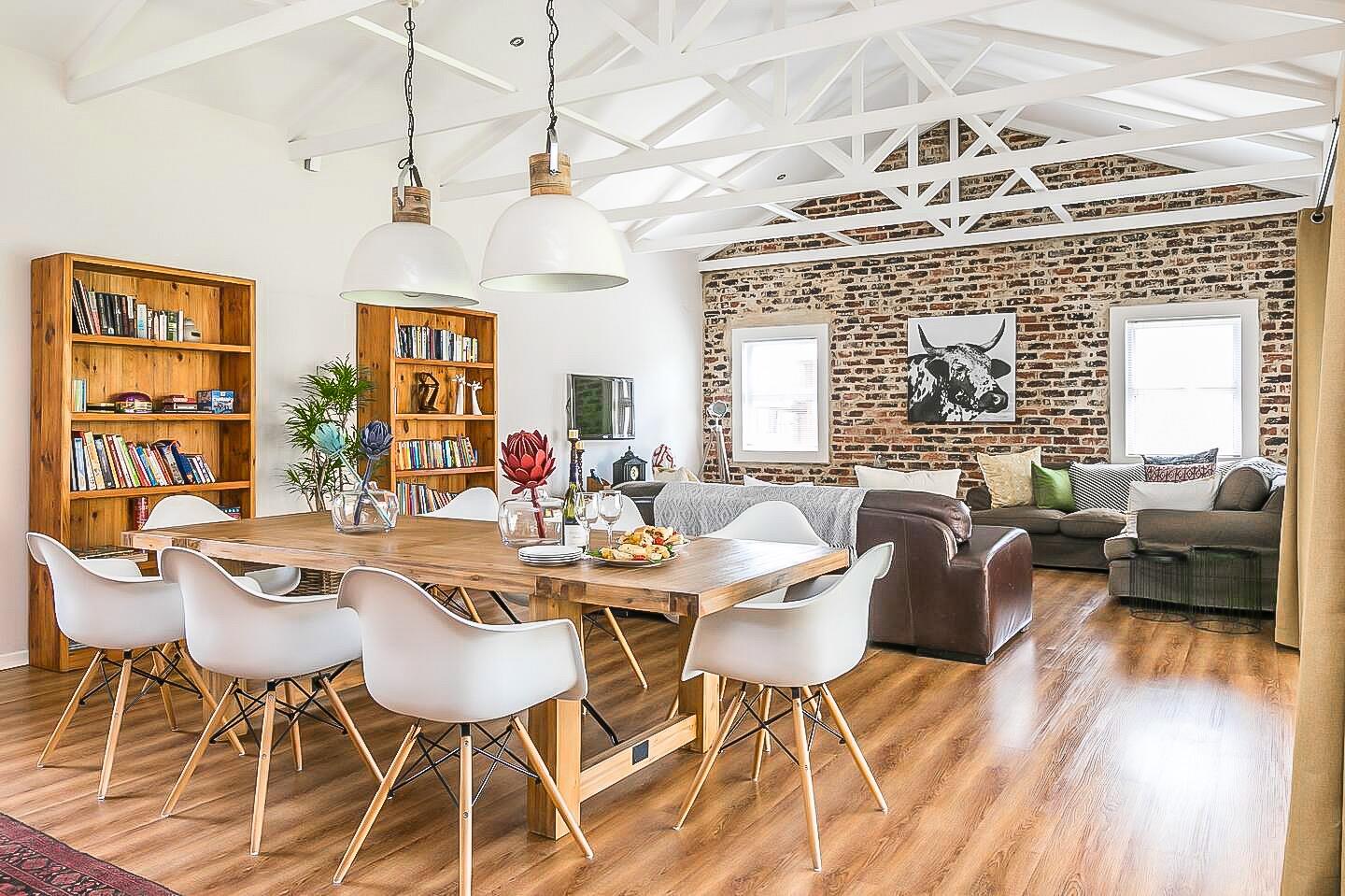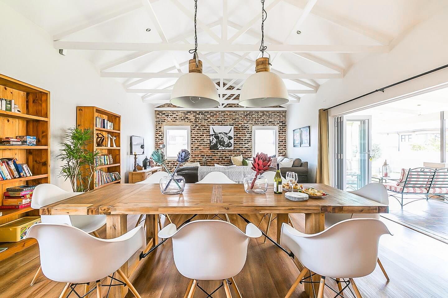 Upon entry, you're welcomed into an inviting entrance hall that leads to a spacious open-plan living area, dining room, and kitchen. The living room, adorned with exposed beams, a brick feature wall, and a vaulted ceiling, exudes warmth and character, opening up through stackable doors to a large covered patio—perfect for indoor-outdoor living and entertaining.