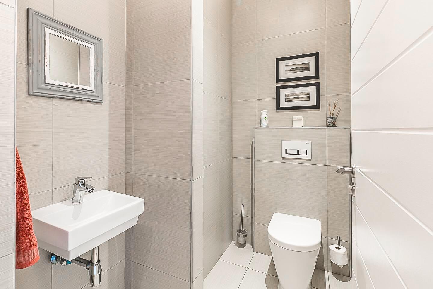 The modern kitchen is a chef's delight, featuring a centre island, gas hob, electric oven, and separate scullery with space for three under-counter appliances. Unique light fittings add a touch of elegance to the kitchen and dining area. The home also includes a guest cloakroom.