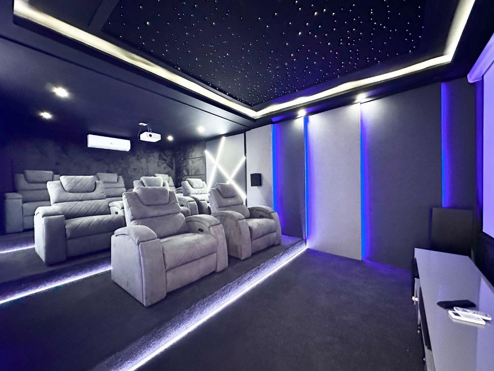 Entertainment is elevated in this home, with a private cinema room, a stylish patio area with a built-in bar, and a sparkling swimming pool surrounded by a spacious garden—ideal for both relaxation and hosting guests.