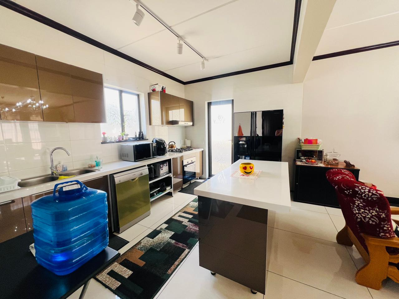 As you enter, you are greeted by a spacious living area featuring a stylish lounge and dining room. Sleek white gloss floor tiles flow throughout, creating a welcoming and sophisticated atmosphere. The kitchen is a gourmet's dream, centered around a sleek gas stove that makes cooking a pleasure for any culinary enthusiast.