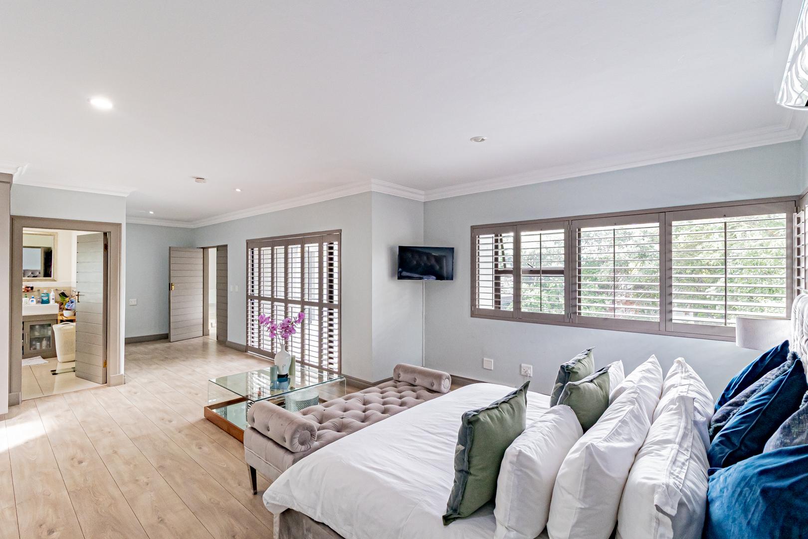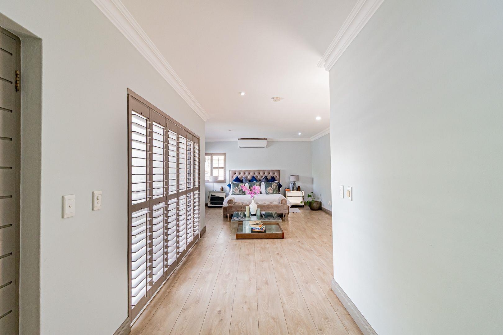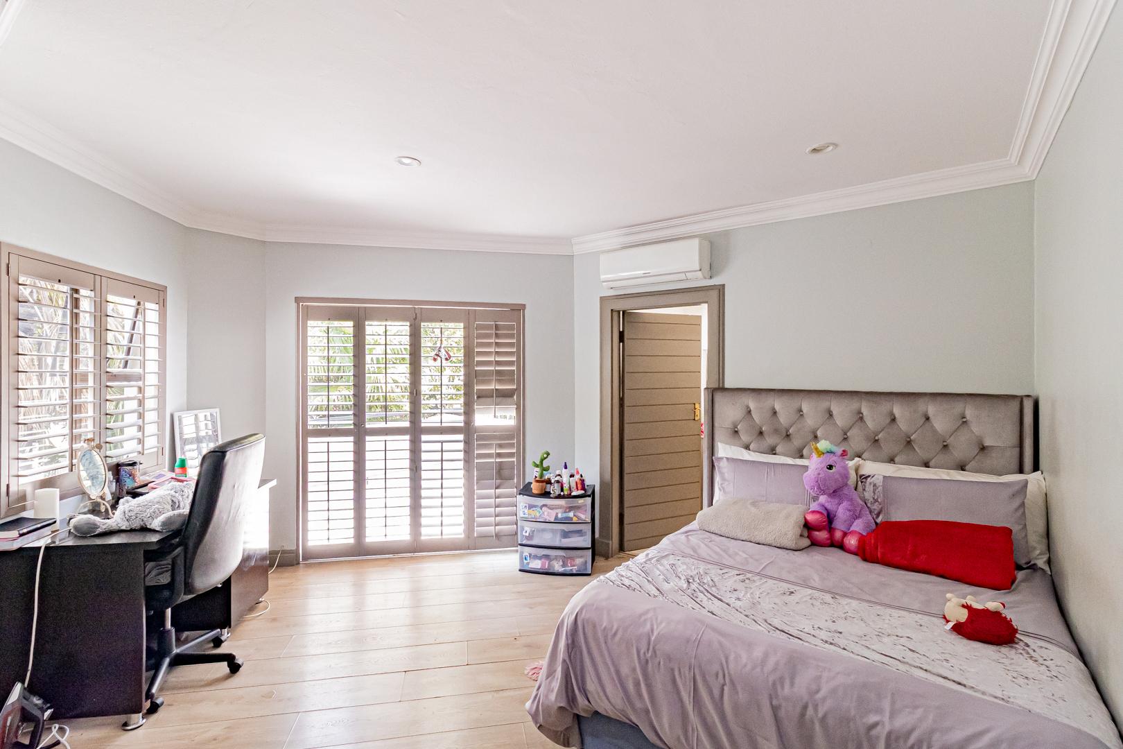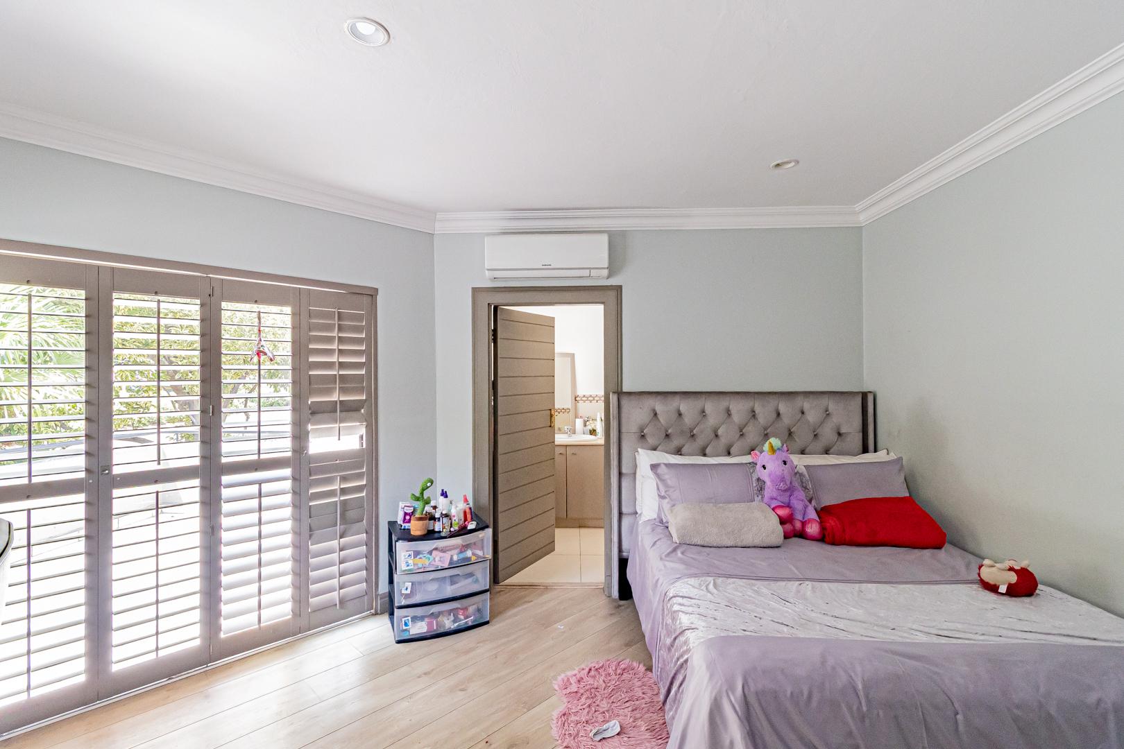 Upstairs is a relaxed pyjama lounge which creates a central family space surrounded by four generously sized bedrooms. Two bedrooms enjoy private en suite bathrooms while the remaining rooms share a modern family bathroom. Each bedroom is fitted with built-in cupboards, air conditioning and opens onto a spacious balcony with a built-in braai. A unique spiral staircase connects the balcony directly to the garden enhancing the home’s indoor-outdoor lifestyle.