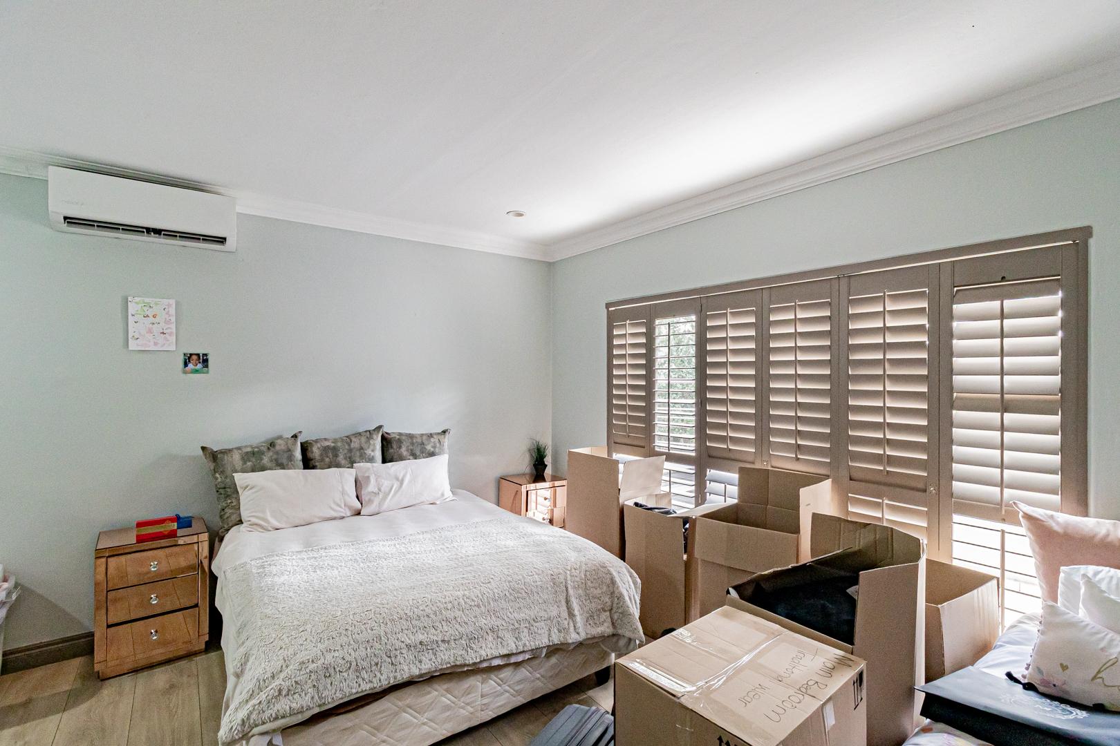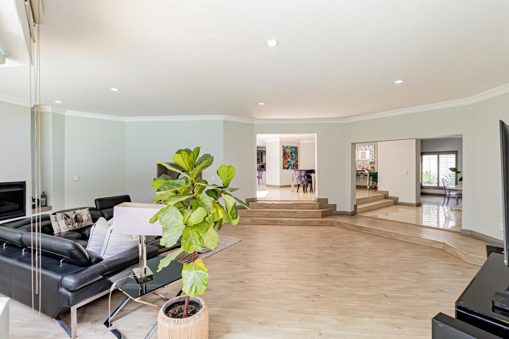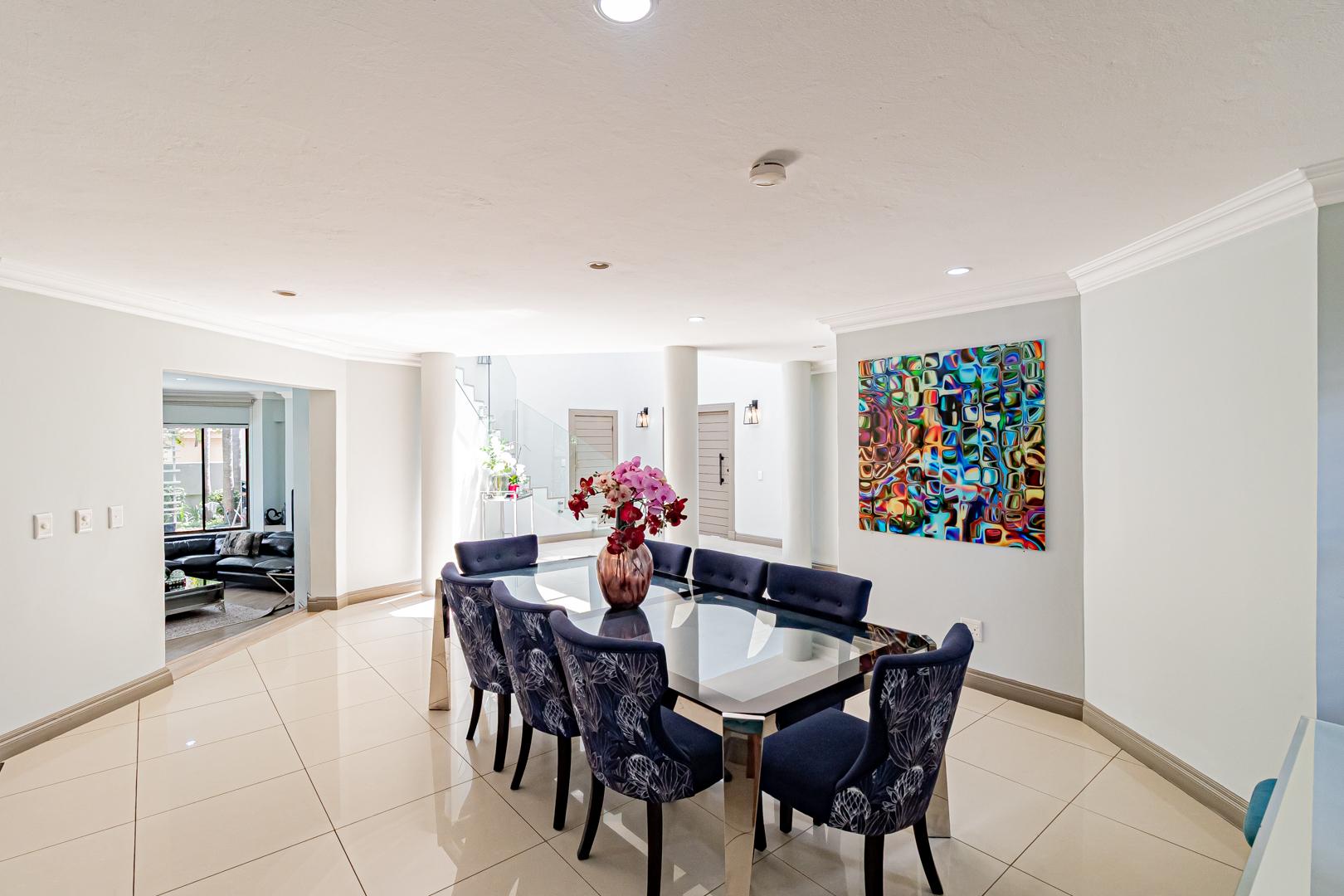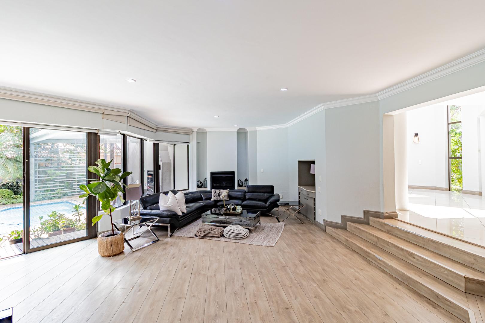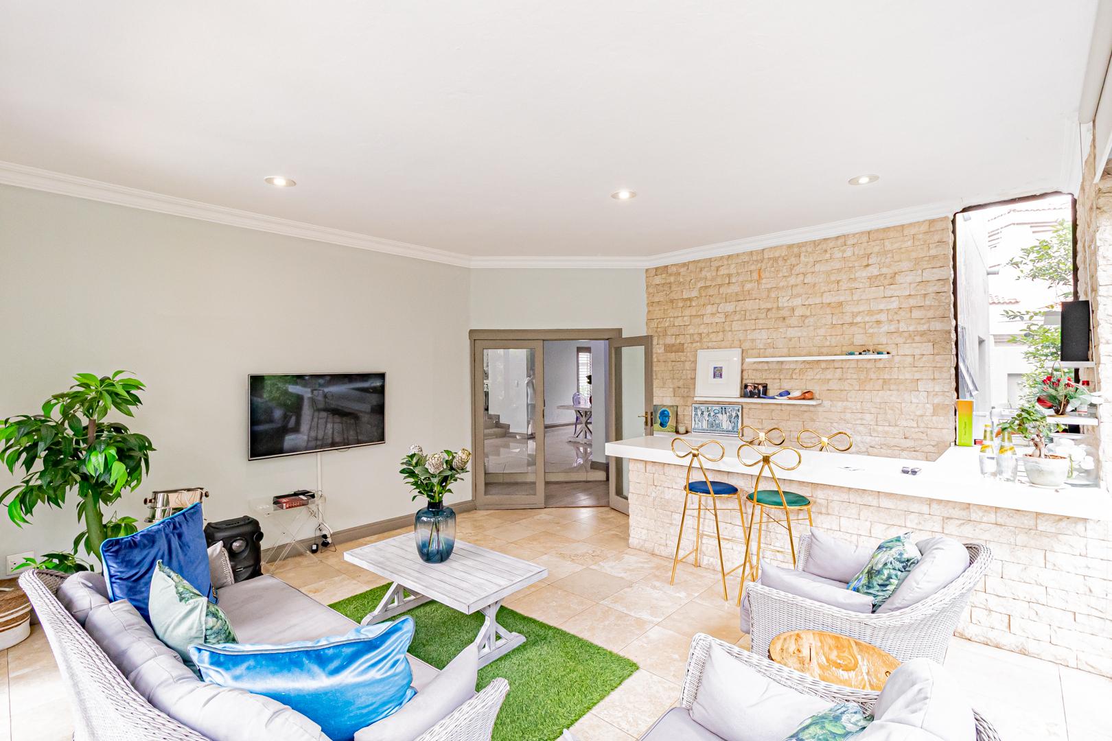 Upstairs is a relaxed pyjama lounge which creates a central family space surrounded by four generously sized bedrooms. Two bedrooms enjoy private en suite bathrooms while the remaining rooms share a modern family bathroom. Each bedroom is fitted with built-in cupboards, air conditioning and opens onto a spacious balcony with a built-in braai. A unique spiral staircase connects the balcony directly to the garden enhancing the home’s indoor-outdoor lifestyle.