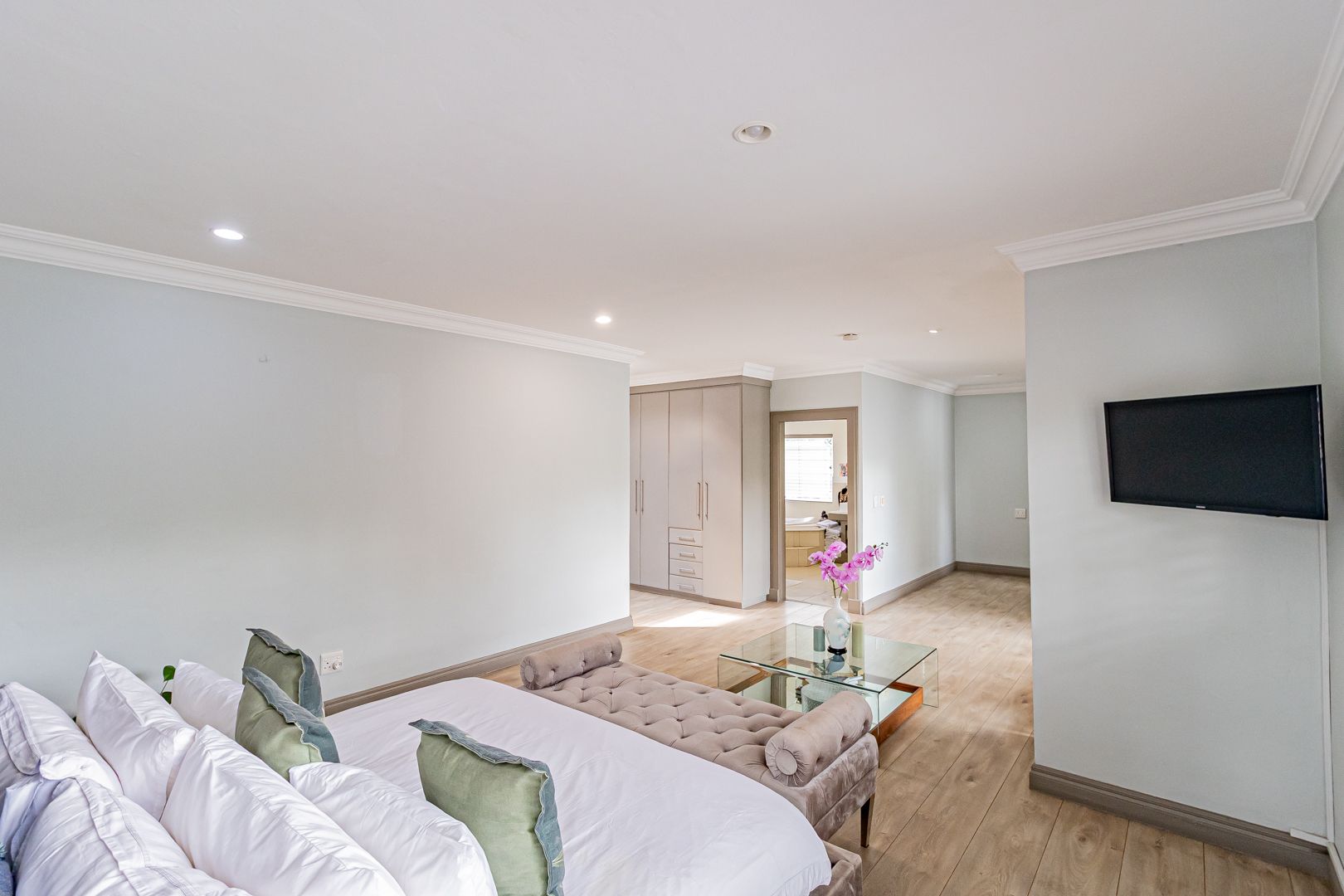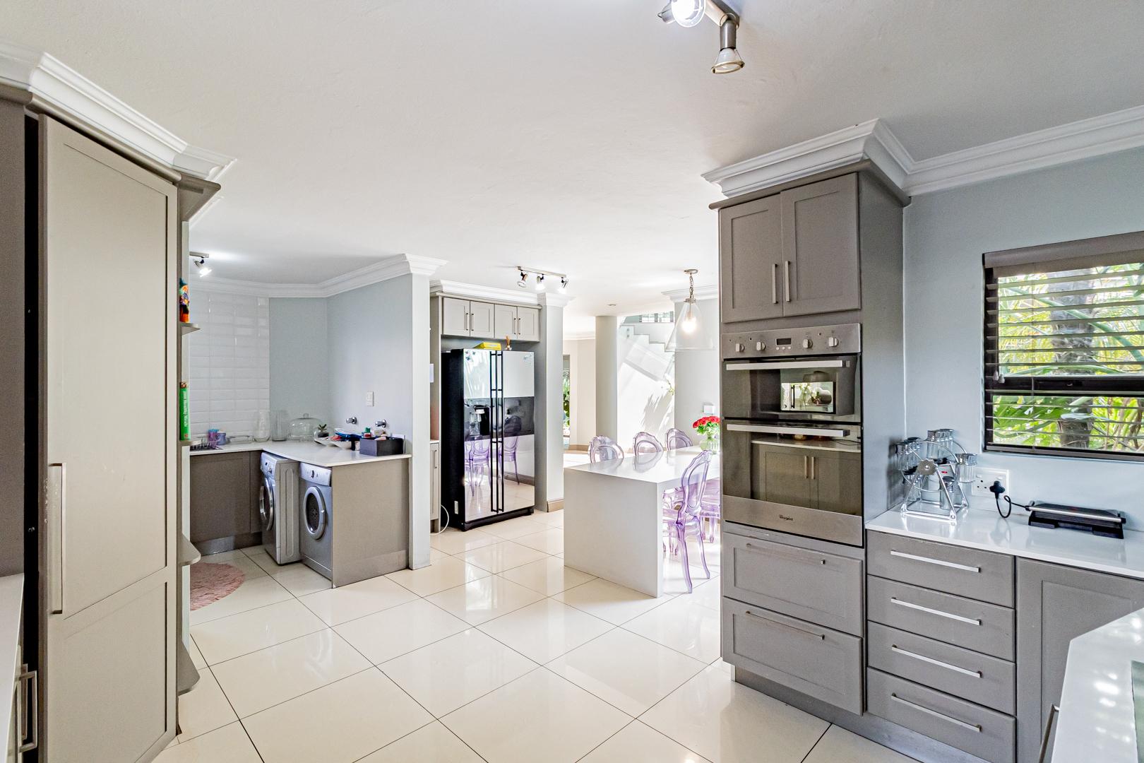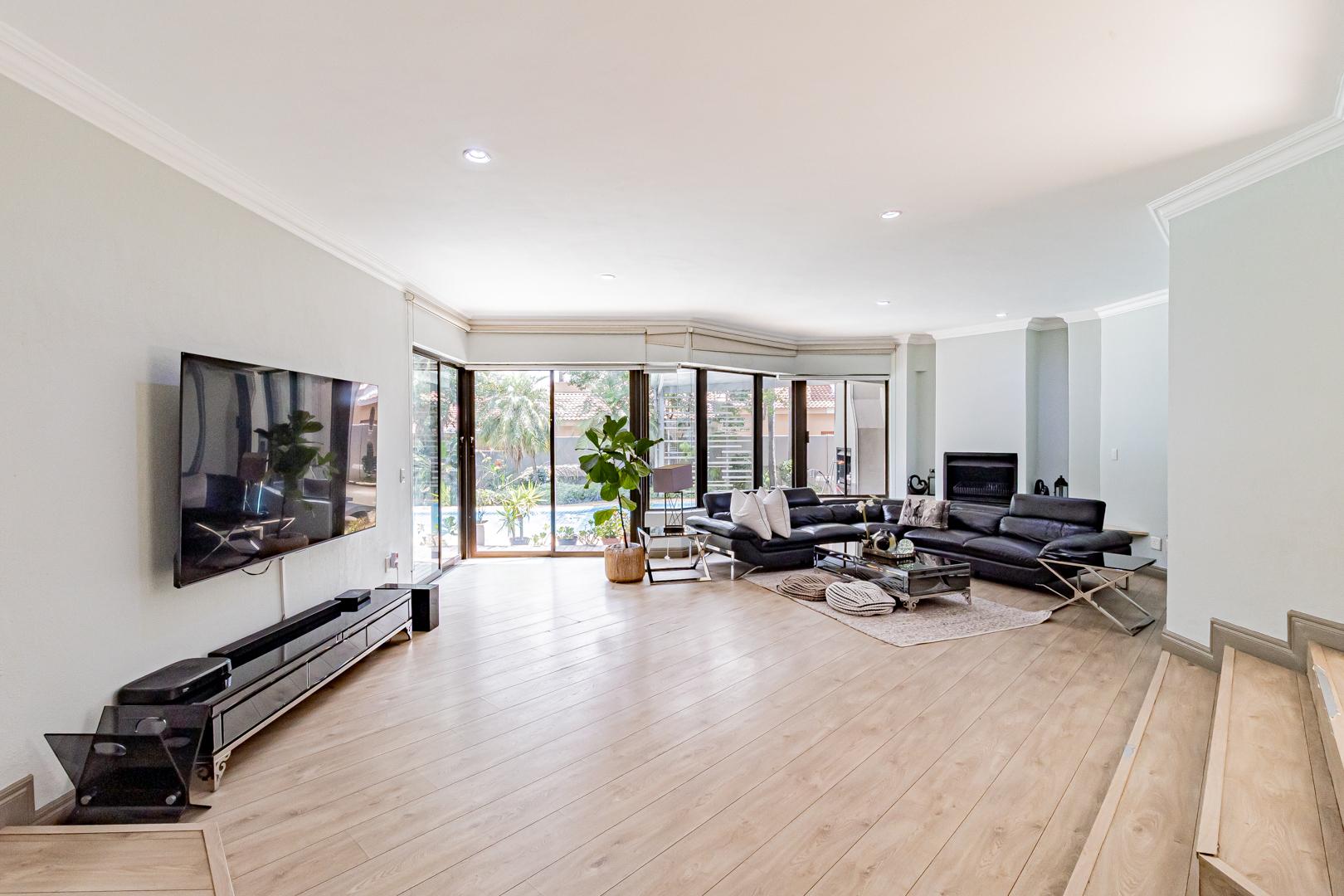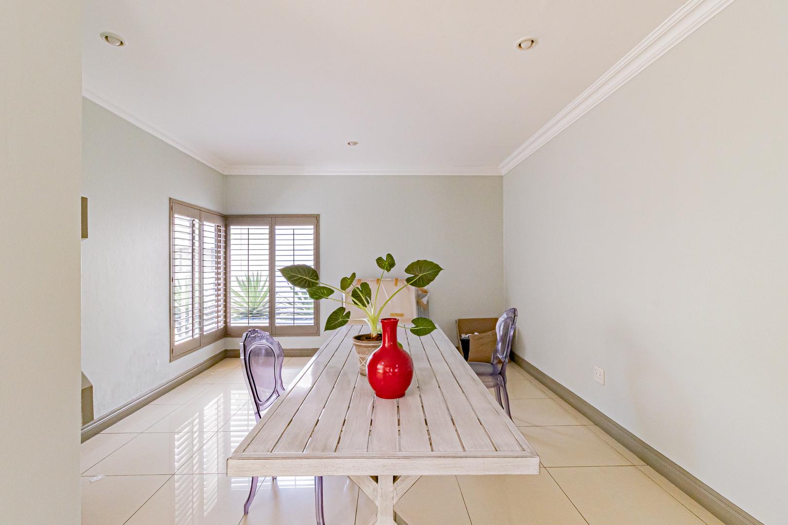 Upstairs is a relaxed pyjama lounge which creates a central family space surrounded by four generously sized bedrooms. Two bedrooms enjoy private en suite bathrooms while the remaining rooms share a modern family bathroom. Each bedroom is fitted with built-in cupboards, air conditioning and opens onto a spacious balcony with a built-in braai. A unique spiral staircase connects the balcony directly to the garden enhancing the home’s indoor-outdoor lifestyle.