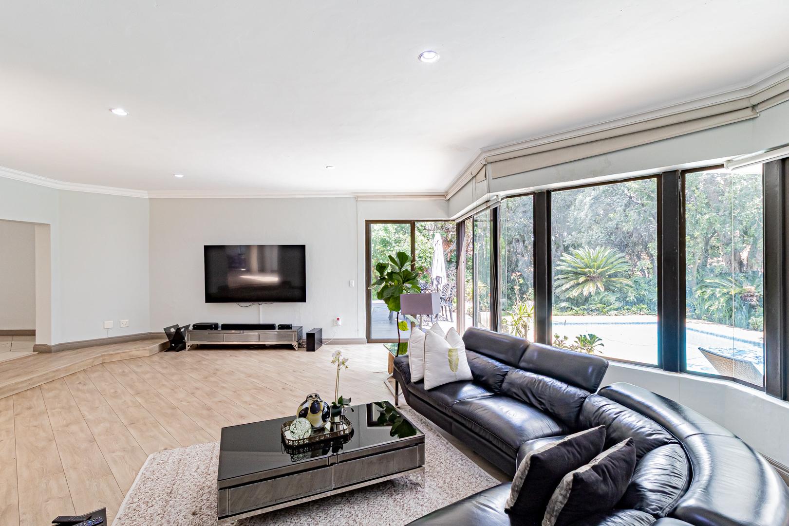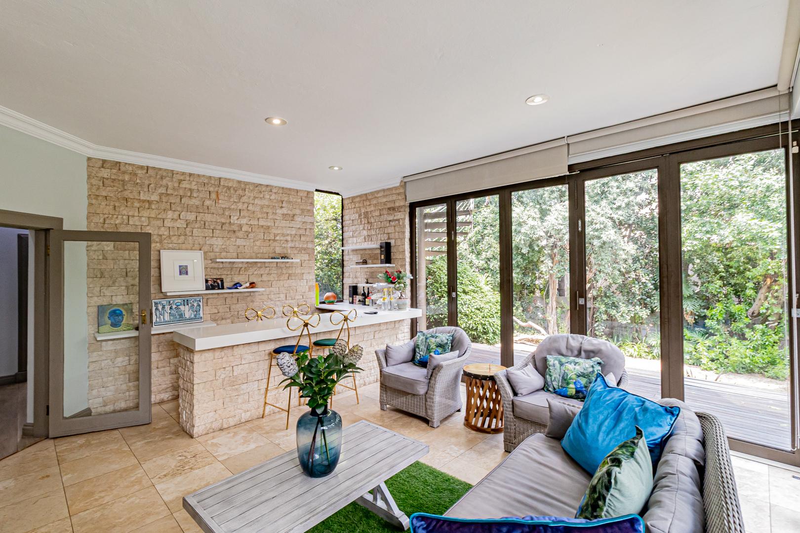 Large glass openings lead to an inviting covered patio with a built-in bar ideal for entertaining guests. Overlooking a sparkling swimming pool and beautifully landscaped garden the outdoor area offers a tranquil retreat for leisure and social gatherings alike.