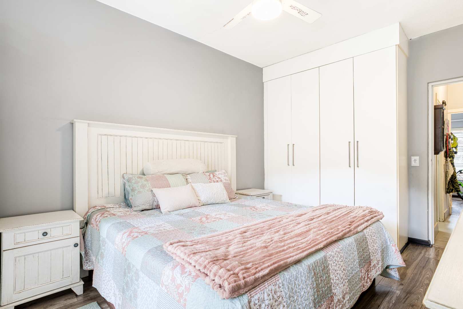 Both bedrooms are well-sized with built-in cupboards, while the full bathroom is neatly designed to serve both residents and guests.
