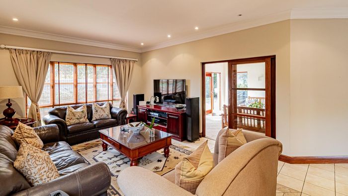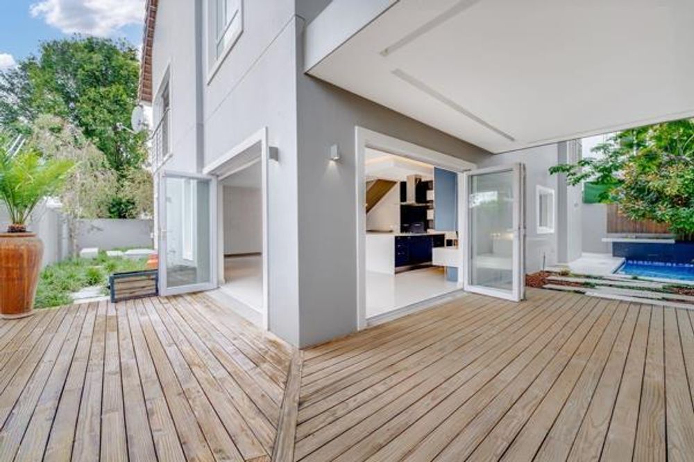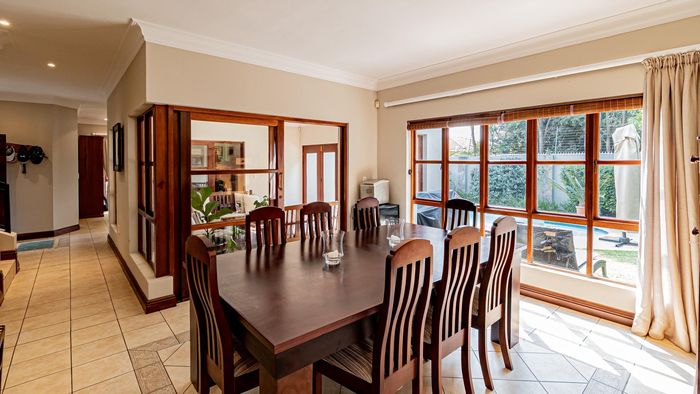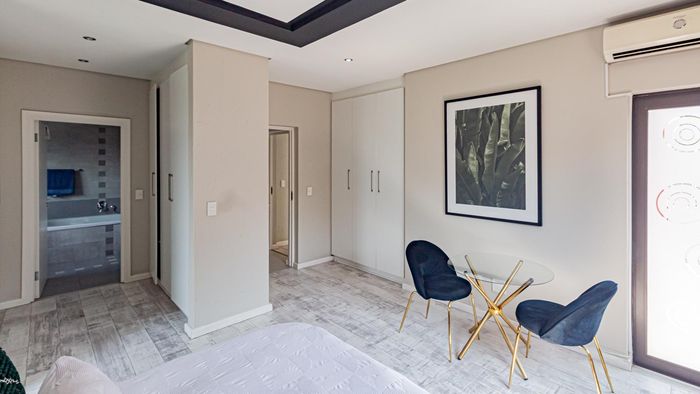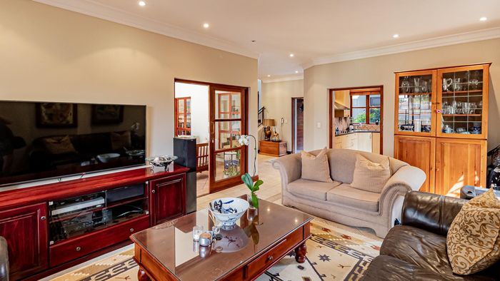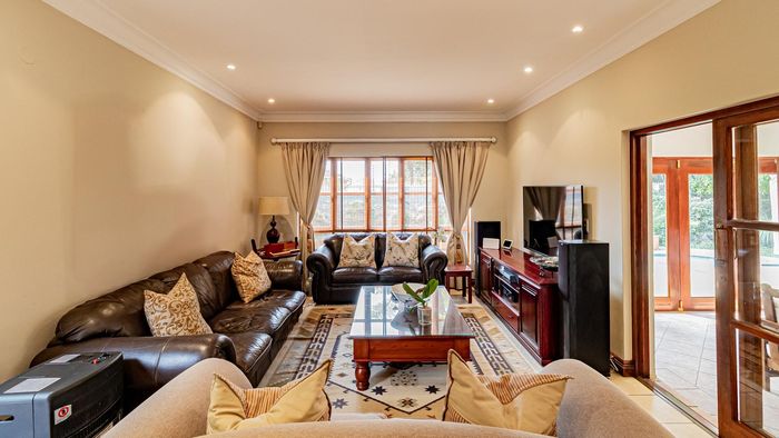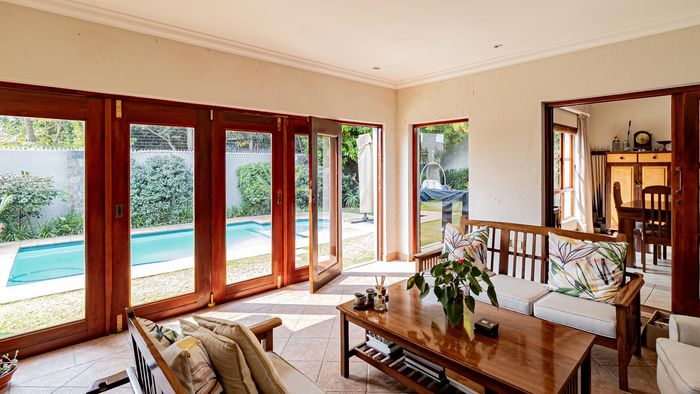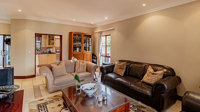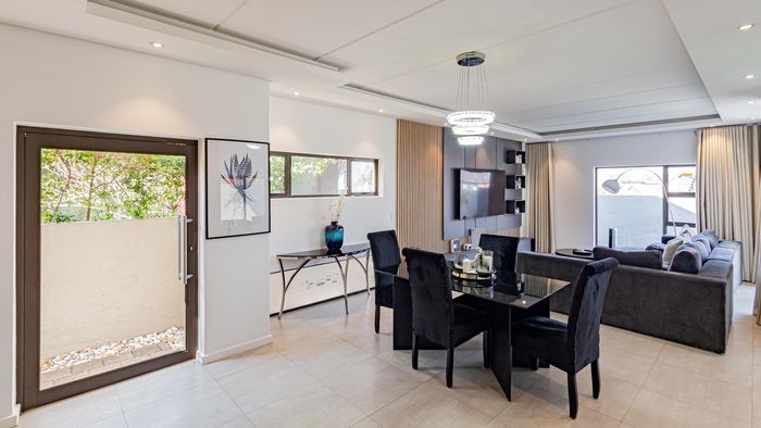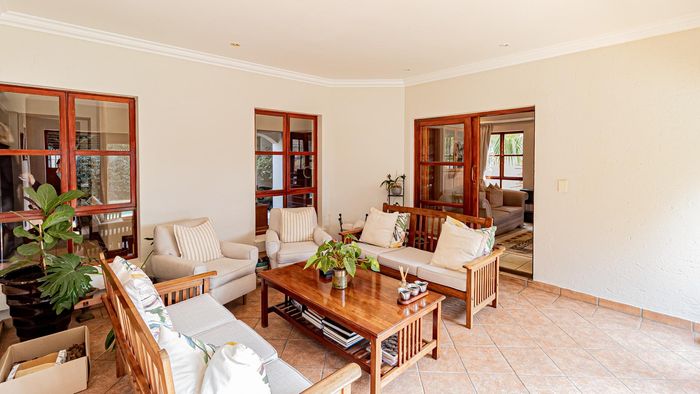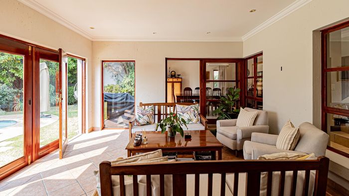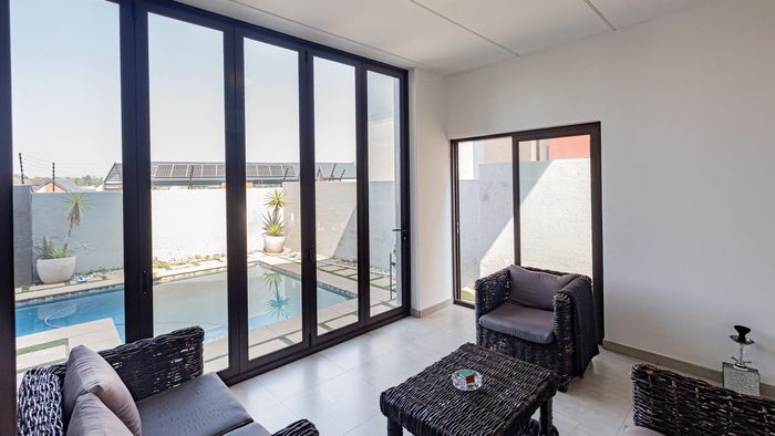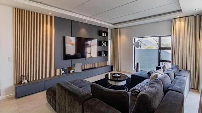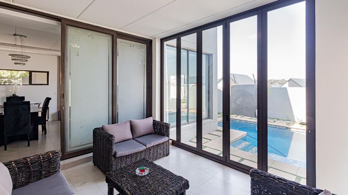 Nestled within the prestigious Broadacres Country Estate, this exquisitely designed home epitomizes the perfect blend of contemporary elegance and everyday comfort. From the moment you enter, you're greeted by a sunlit, open-plan living area where sleek lines harmonize with warm textures. The living room exudes sophistication, featuring a curved sectional sofa, layered rugs, and standout artwork that create an inviting atmosphere. The entertainment wall, adorned with stone accents and a gas fireplace, adds a luxurious touch, ideal for cozy evenings at home. Effortless indoor-outdoor flow is achieved through stacking doors that open onto a covered patio with wooden decking. Enjoy this serene space surrounded by lush greenery and a sparkling pool, perfect for both relaxation and entertaining.