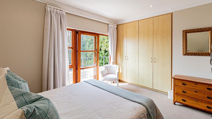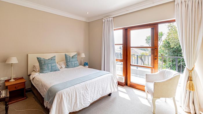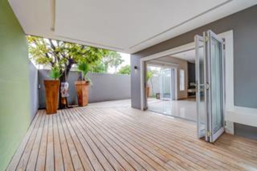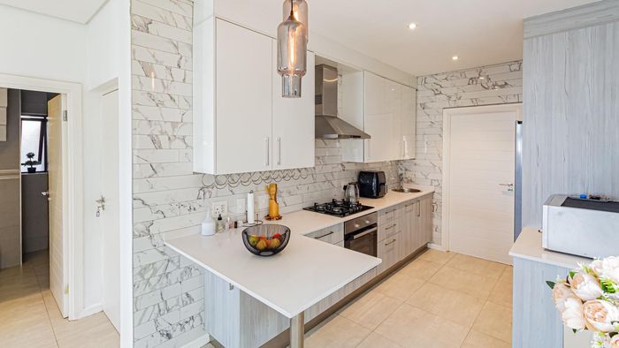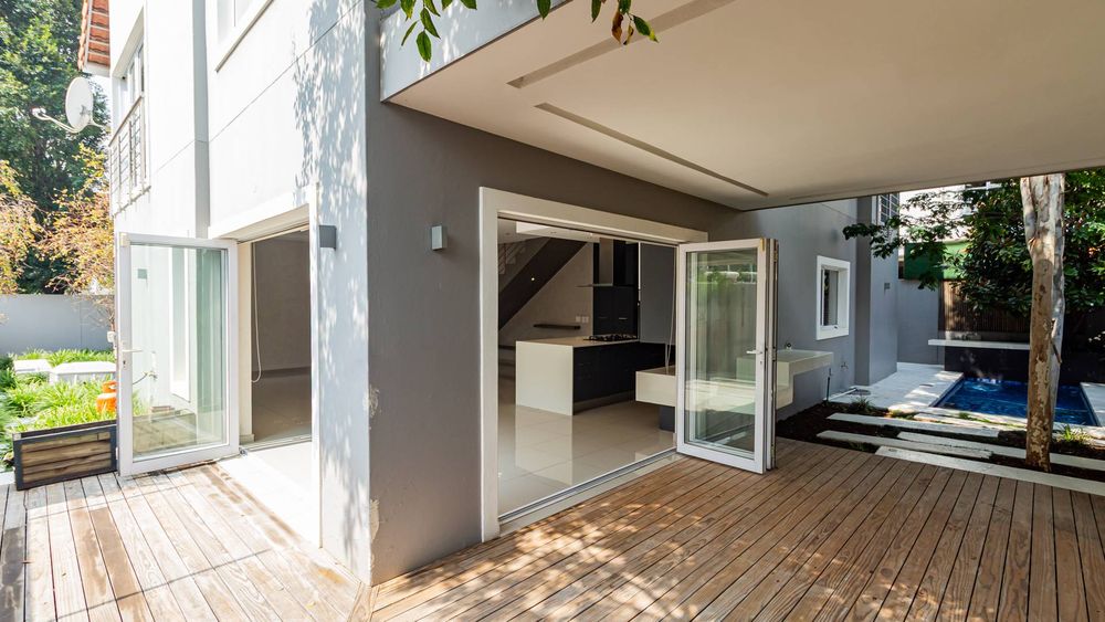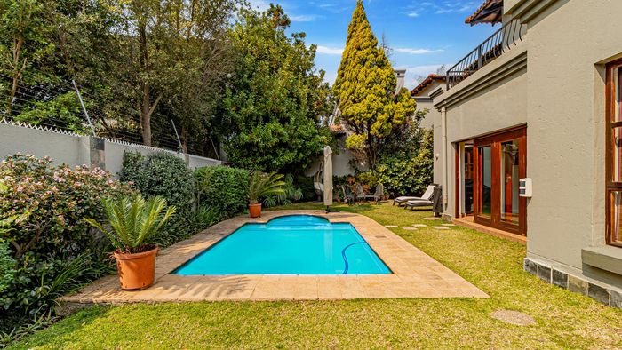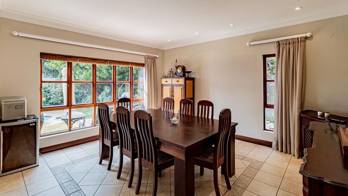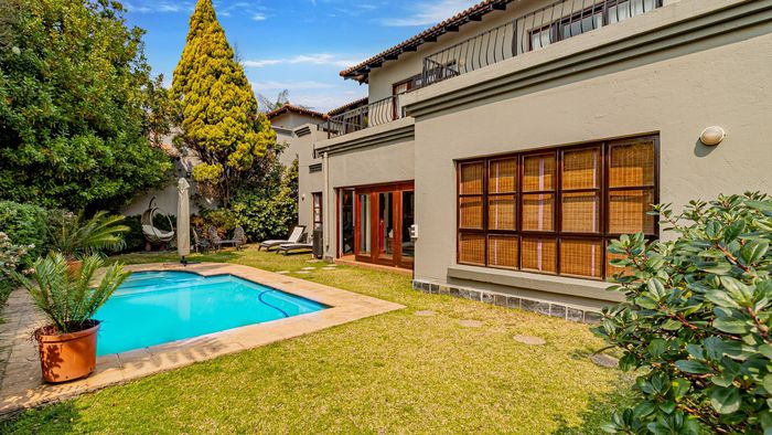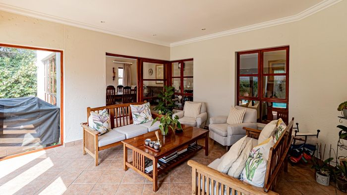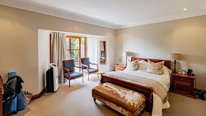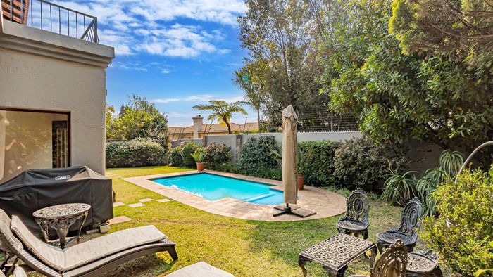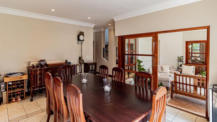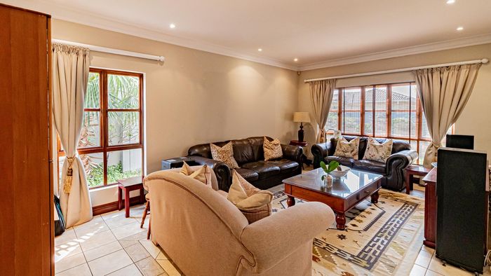 Nestled within the prestigious Broadacres Country Estate, this exquisitely designed home epitomizes the perfect blend of contemporary elegance and everyday comfort. From the moment you enter, you're greeted by a sunlit, open-plan living area where sleek lines harmonize with warm textures. The living room exudes sophistication, featuring a curved sectional sofa, layered rugs, and standout artwork that create an inviting atmosphere. The entertainment wall, adorned with stone accents and a gas fireplace, adds a luxurious touch, ideal for cozy evenings at home. Effortless indoor-outdoor flow is achieved through stacking doors that open onto a covered patio with wooden decking. Enjoy this serene space surrounded by lush greenery and a sparkling pool, perfect for both relaxation and entertaining.