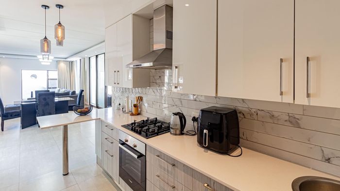 The kitchen is a true masterpiece of design and functionality. It boasts glossy cabinetry in contrasting tones, a central island with a gas cooktop, a stainless steel range hood, and integrated appliances. Thoughtful lighting and decorative shelving infuse the space with warmth and character, while the adjoining dining area seamlessly connects to the living space.