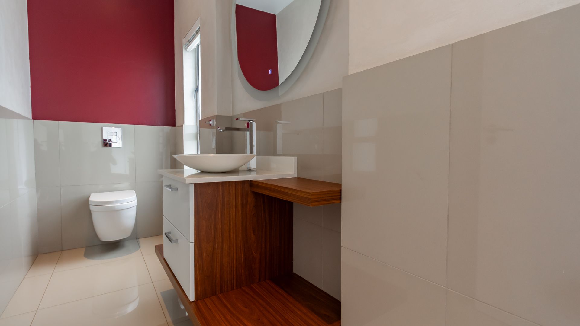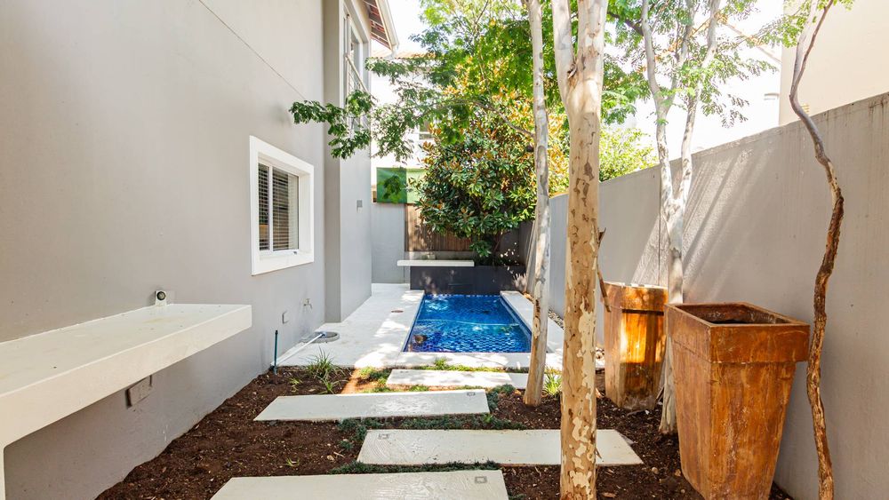 The outdoor living experience is equally impressive, featuring a private patio framed by lush greenery, vibrant accent walls, and a pool that offers a secluded escape. Additional features include private staff accommodation with a separate entrance and a double automated garage providing direct access into the home.