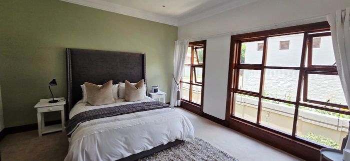 Executive sanctuary on Bryanston East's premier street, ideal for corporate tenants, with multiple terraces overlooking garden and pool, gourmet kitchen and four en-suite bedrooms.