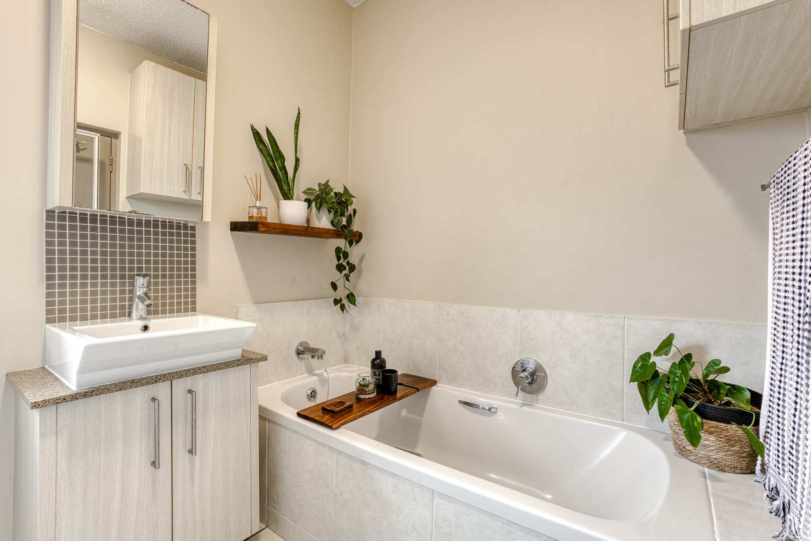 Two well-sized bedrooms share a modern full bathroom, offering a comfortable and elegant retreat. Upstairs, a versatile loft space opens onto a large rooftop terrace with a built-in bar, perfect for entertaining friends and enjoying Lonehill’s spectacular sunsets.