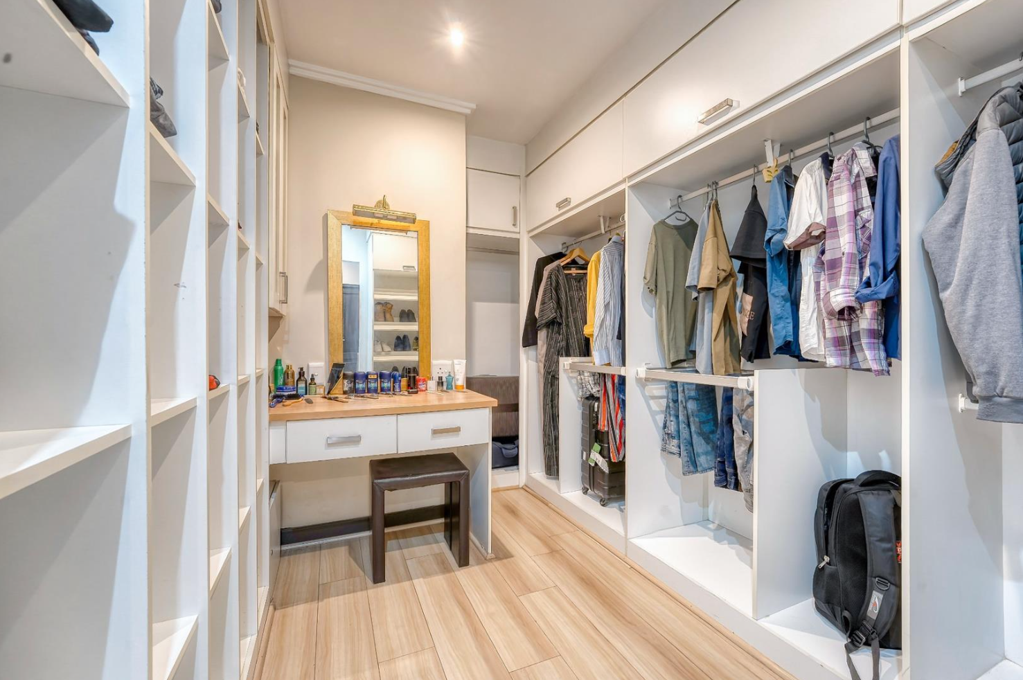 On the ground floor, there is a versatile room designed with built-in shelving and desks. This space can easily transform into a spacious office, an additional bedroom, or a private guest suite, complete with an adjacent bathroom for added convenience.