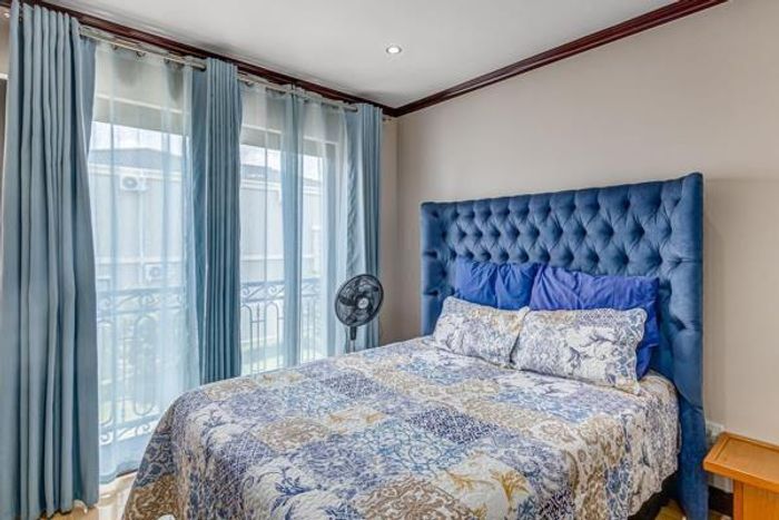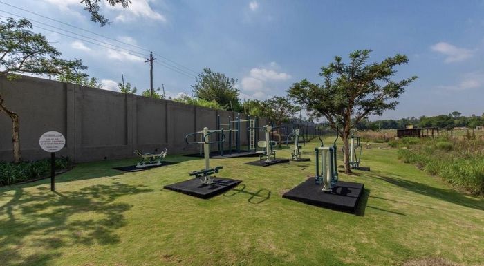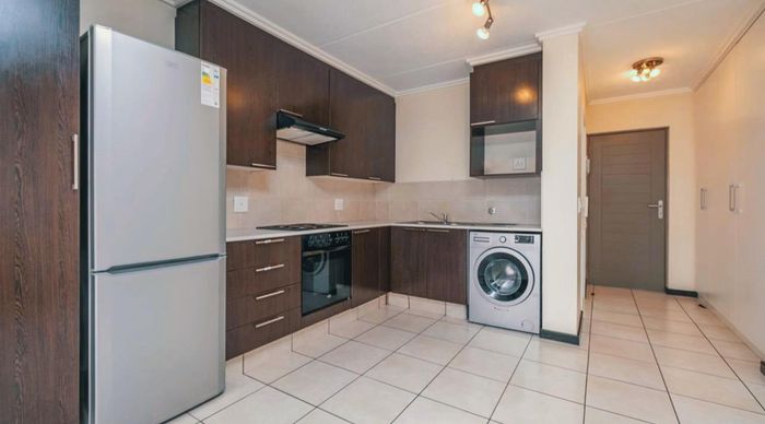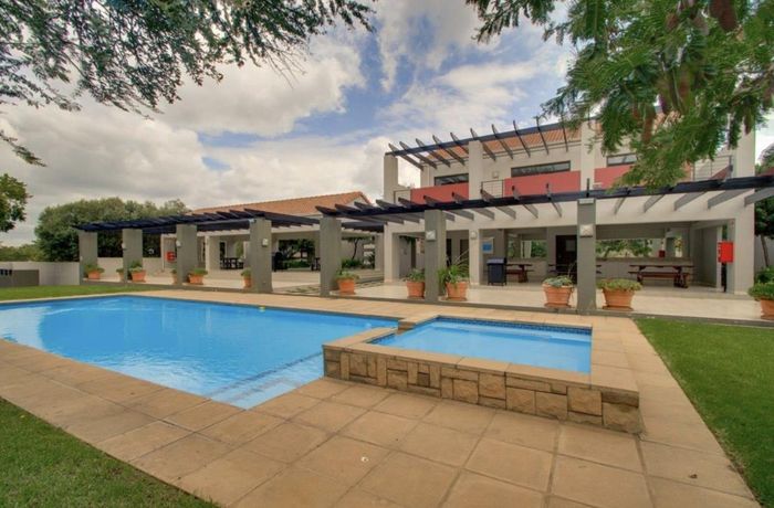 Resort-style suburban living with easy access to Cedar Square, Fourways Mall and Montecasino, featuring a glossy modern kitchen and covered patio opening onto flowing communal gardens.