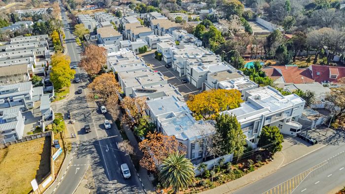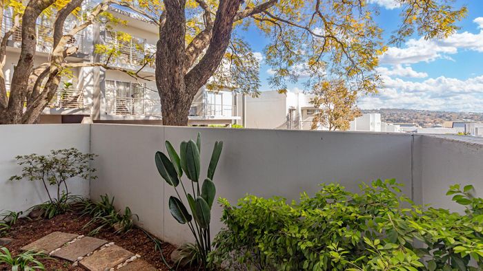 Sophisticated family living in Bryanston close to St Stithians and Sandton CBD — entertainer's layout centered around a private cantilever balcony; four bedrooms, double garage.