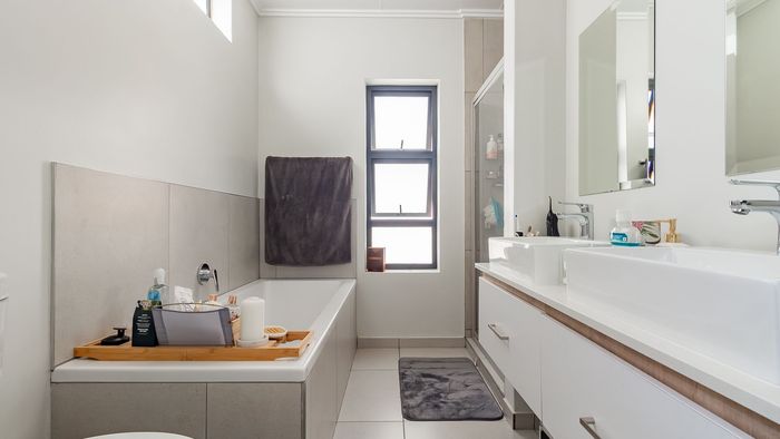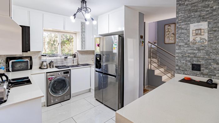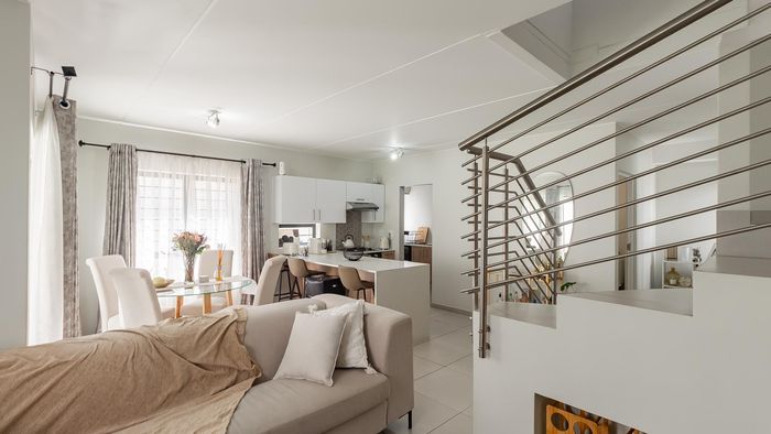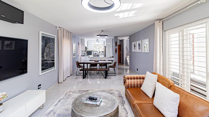 Relax in secure Vachellia Estate living in Broadacres, near Fourways Mall, with a modern kitchen and covered patio leading to a private garden. Three beds, 2.5 baths, double garage.