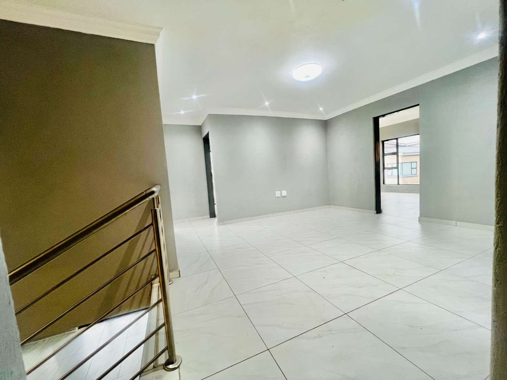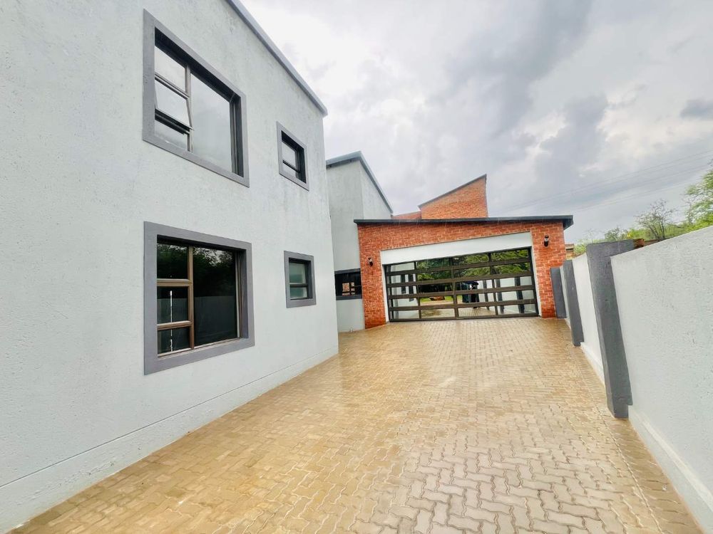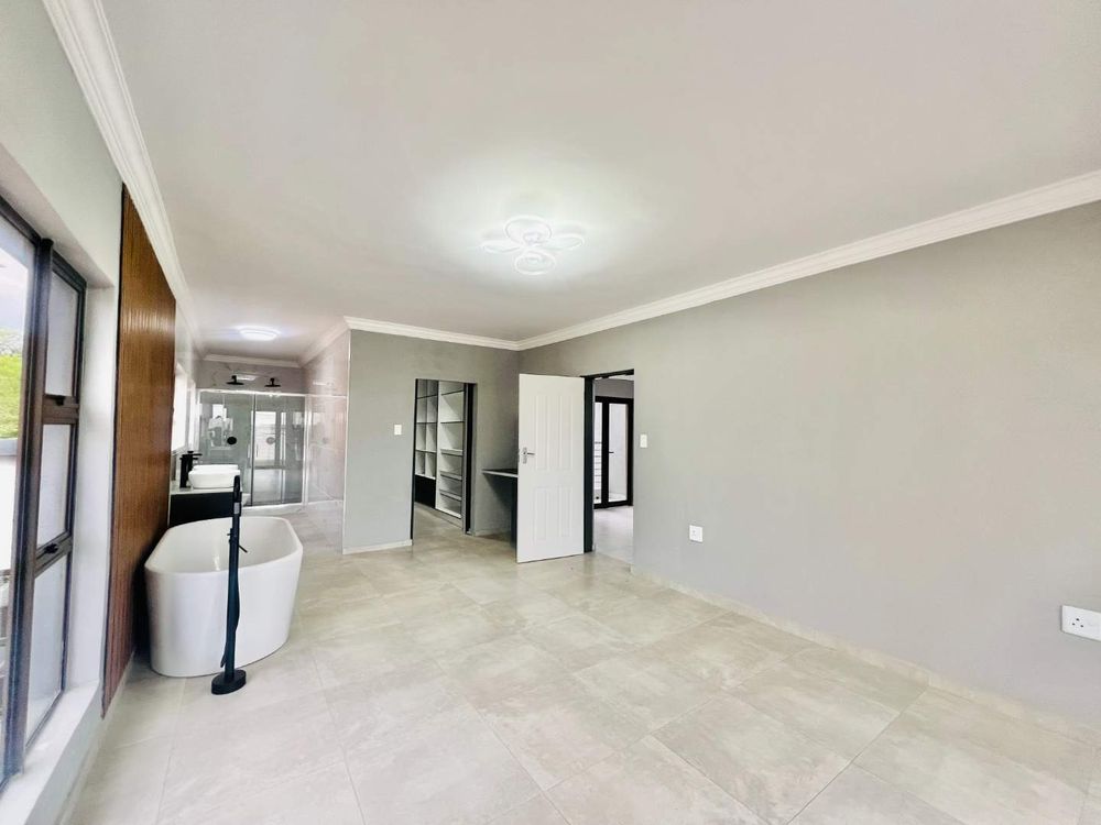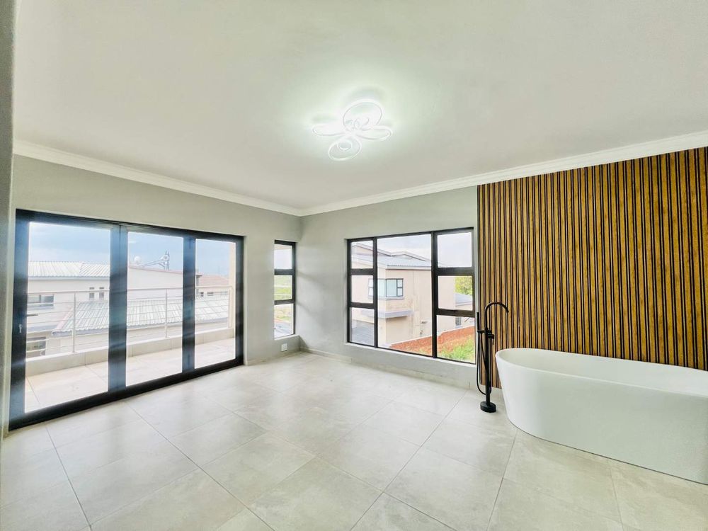 Step into contemporary luxury with this brand-new home set in a secure eco estate with free-roaming wildlife and premium lifestyle amenities. The light-filled open-plan design includes two spacious lounges, a modern kitchen with scullery, a downstairs bedroom with a full bathroom, and seamless flow to the built-in braai area and jacuzzi—perfect for relaxed entertaining.