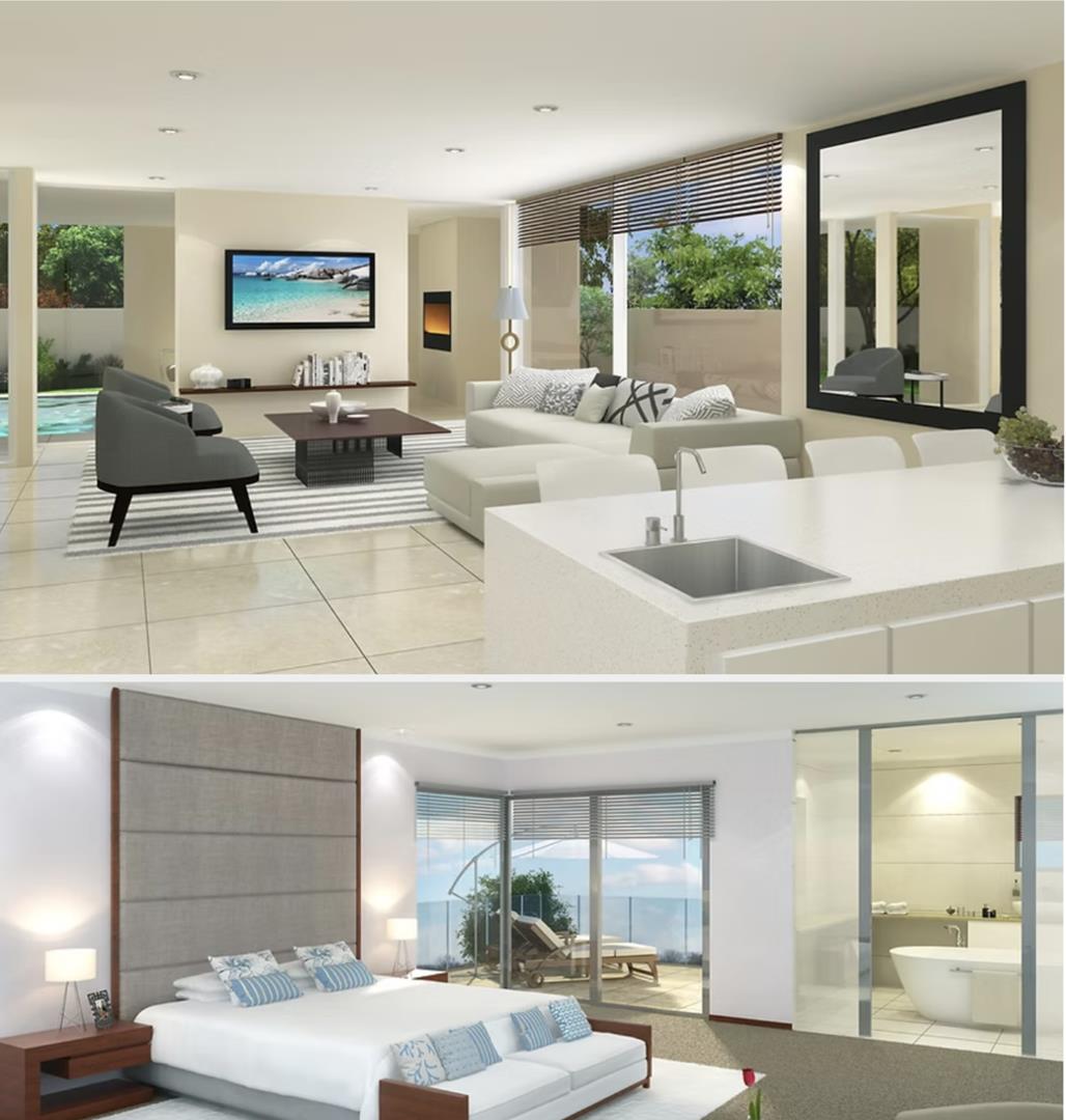 The open-plan layout seamlessly connects the designer kitchen, dining area, and lounge, creating a perfect space for both entertaining and everyday living. The kitchen boasts top-end appliances and finishes, complete with a scullery to keep things tidy and organized.