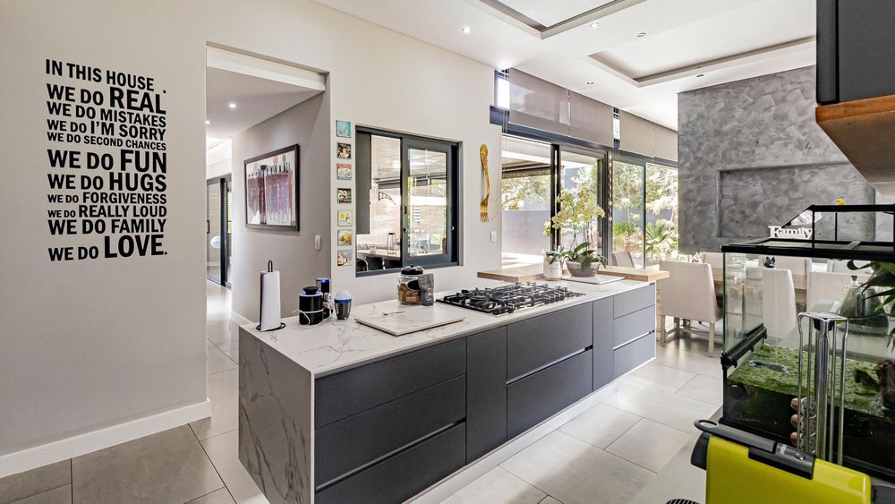 The contemporary kitchen is both stylish and functional, offering ample cabinetry and workspace, ideal for everyday living and entertaining. The living areas are well-proportioned and designed for relaxed estate living.